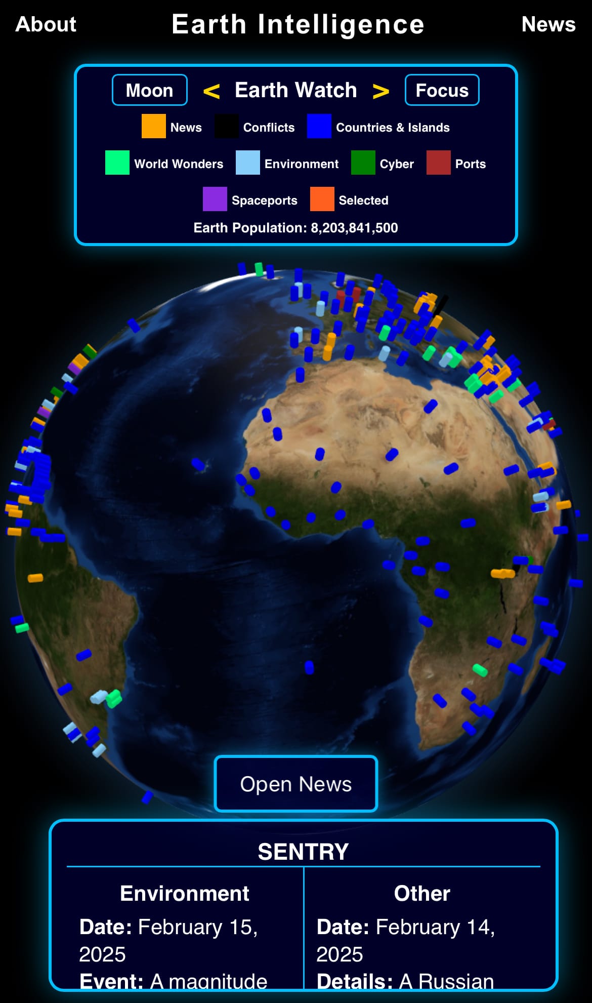 - At the heart of this vision is the Earth Intelligence System, which you can explore by clicking the image below. This system is designed to aggregate, analyze, and visualize the world’s data, offering tools like interactive maps and visualized insights to make complex intelligence accessible and actionable. Earth Intelligence System (click to view):