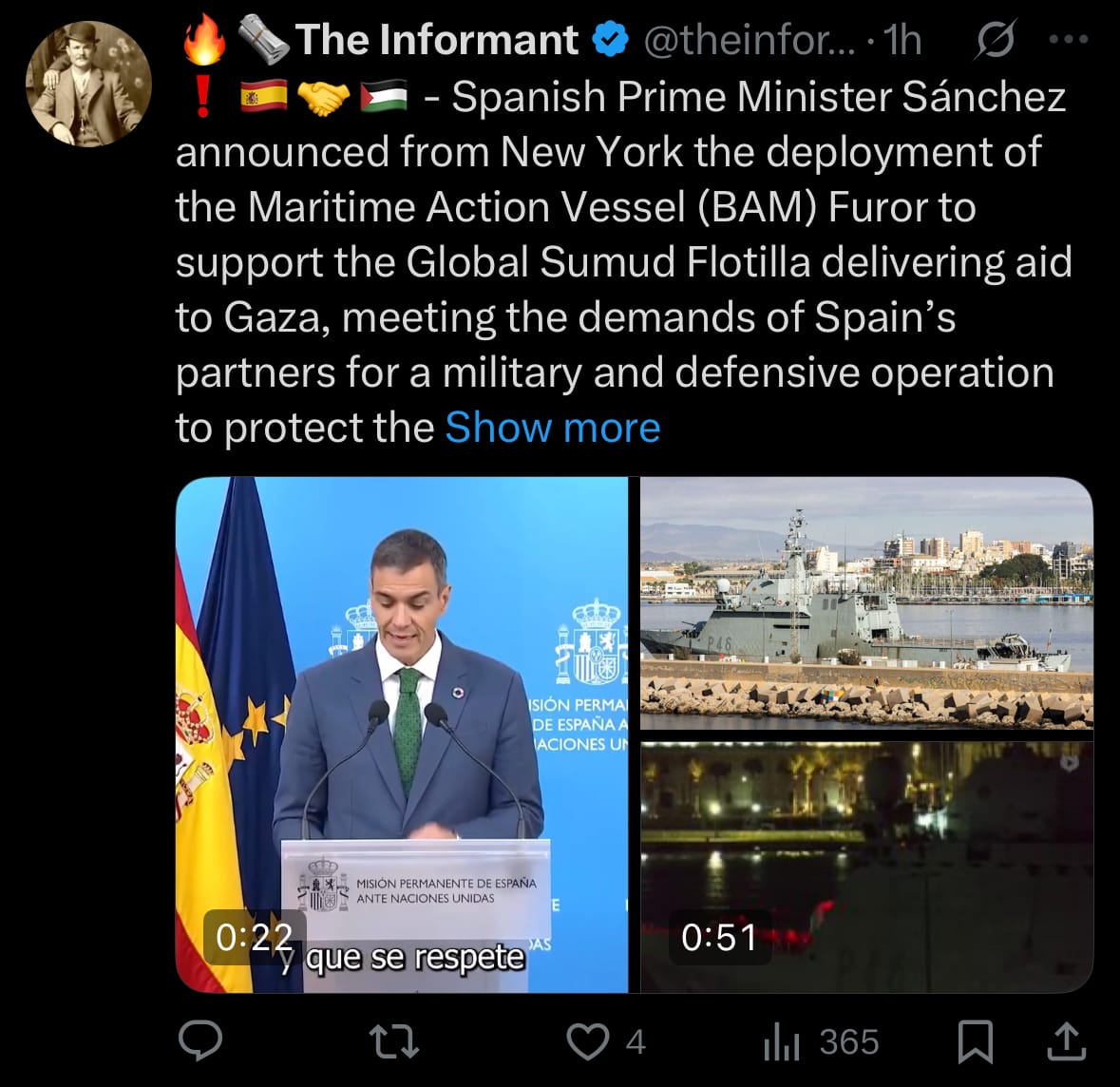 - On September 25, 2025, Spanish Prime Minister Pedro Sánchez, speaking from New York during the UN General Assembly, announced the deployment of the Spanish Navy's Maritime Action Vessel (BAM) Furor to support and protect the Global Sumud Flotilla, a civilian-led humanitarian mission aiming to deliver aid to Gaza amid the ongoing blockade. This decision aligns with requests from Spain's coalition partners for a defensive military escort, following reports of drone attacks on the flotilla near Greece in the Mediterranean Sea. Italy has similarly dispatched a naval vessel for the same purpose, marking a coordinated European effort to ensure the flotilla's safety without direct confrontation.
