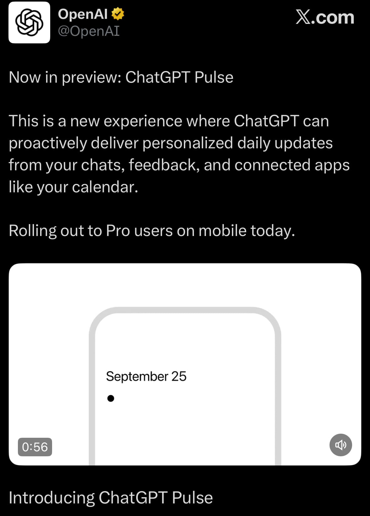 - On September 25, 2025, OpenAI introduced ChatGPT Pulse in preview mode, a feature that provides proactive personalized daily updates drawn from users' past chats, feedback, and linked applications like calendars. It transforms ChatGPT from a response-only system to one that conducts background analysis overnight to create tailored morning summaries, briefs, or recommendations based on individual contexts and interests. The rollout begins with ChatGPT Pro users on mobile platforms, with intentions for wider access after the preview phase, focusing on improving user interaction through subtle AI support.
