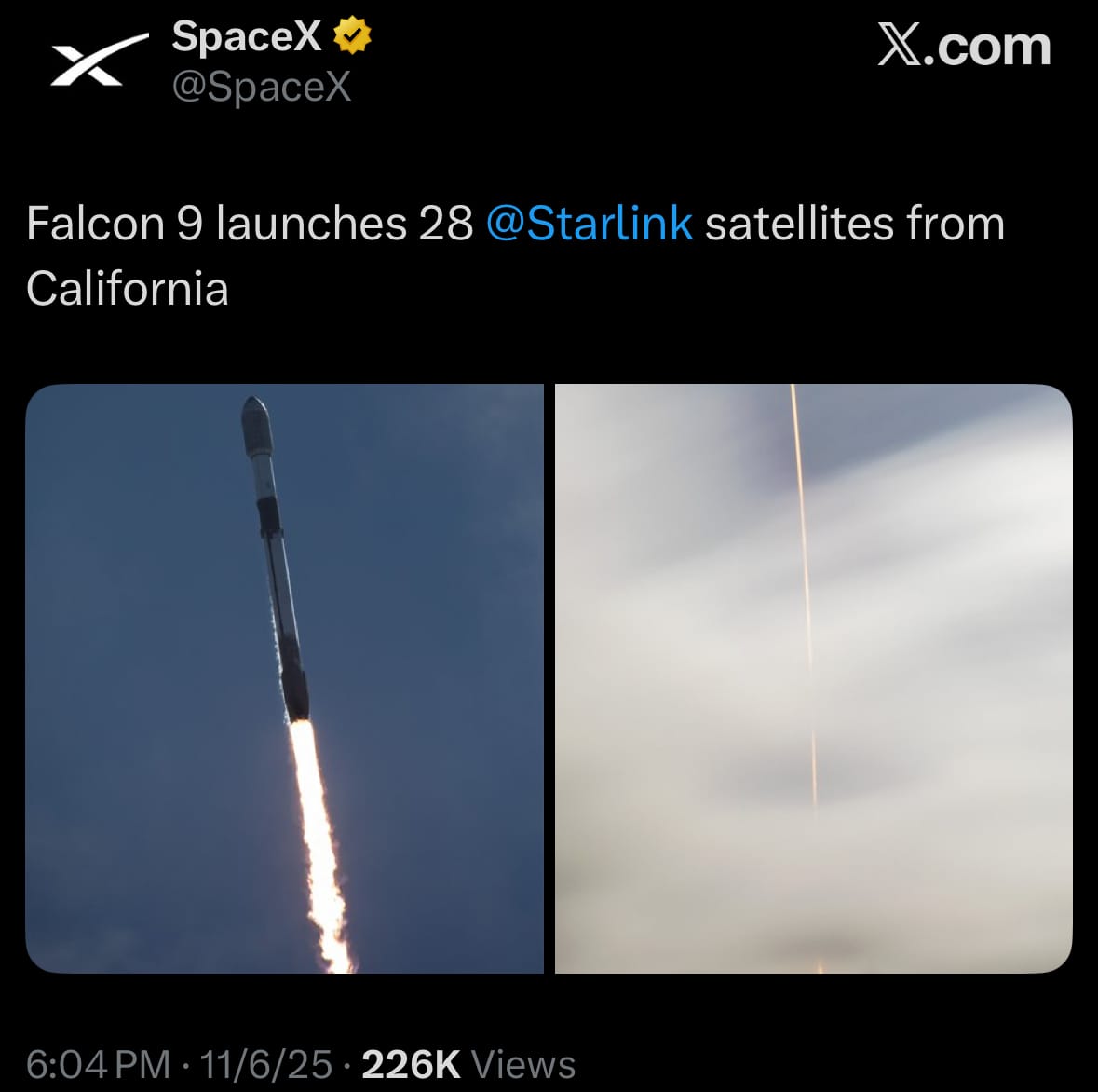- On November 6, 2025, SpaceX successfully launched a Falcon 9 rocket from Space Launch Complex 4 East (SLC-4E) at Vandenberg Space Force Base in California, deploying 28 Starlink satellites into low-Earth orbit as part of the Starlink 11-14 mission. The launch occurred at 1:13 p.m. PST (4:13 p.m. EST), with the first-stage booster landing on the droneship Of Course I Still Love You stationed in the Pacific Ocean, showcasing the company's reusable rocket technology.