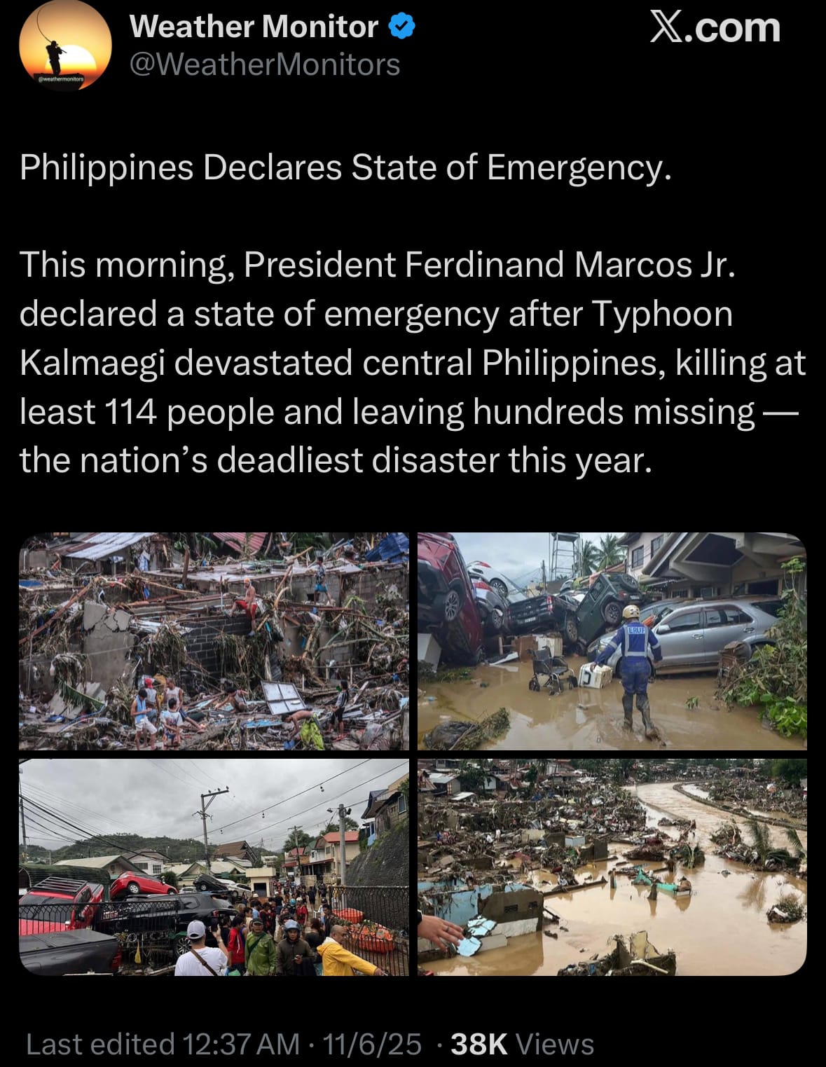 - On November 6, 2025, the death toll from Typhoon Tino, internationally known as Kalmaegi, surpassed 115 in the Philippines, with at least 127 people reported missing, primarily in the central regions of Cebu and Leyte where the storm made landfall two days prior. Heavy rains, floods, and landslides devastated communities, destroying homes, submerging vehicles, and causing widespread power outages affecting over 500,000 households. Emergency aid is being distributed to displaced residents in shelters, while assessments reveal significant infrastructure damage, including blocked roads and disrupted water supplies, prompting a state of calamity declaration in several provinces.