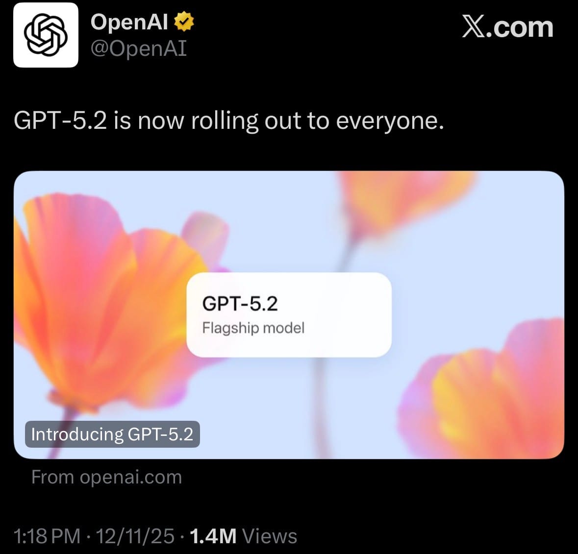 - On December 11, 2025, OpenAI released GPT-5.2, an update to its GPT-5 series of AI models, aimed at improving performance for professional tasks such as coding, analyzing long documents, solving math problems, planning, and generating spreadsheets or presentations. The rollout follows an internal "code red" directive from CEO Sam Altman earlier in the month, which shifted resources in response to competition from models like Google's Gemini 3 and Anthropic's Claude Opus 4.5. GPT-5.2 comes in three variants: Instant for quick responses to simple queries like writing or translation; Thinking for structured work; and Pro for high-accuracy handling of complex issues. Paid ChatGPT subscribers on Plus, Pro, Go, Business, and Enterprise plans gained immediate access, with a gradual rollout for stability; free users will follow later, and developers can use the API right away.