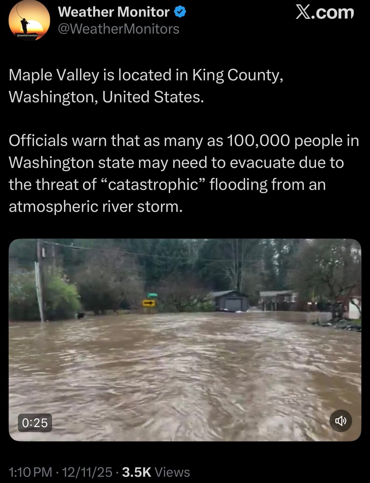 - In King County southeast of Seattle, the Cedar River overflowed, flooding low-lying areas and prompting evacuations in communities such as Maple Valley, where residents reported waist-deep water in homes. A 24/7 shelter opened at New Community Church in Maple Valley with cots, meals, and charging stations (pets not accommodated), and Maple Valley Highway was closed. Statewide, over 4,000 people sought shelter, thousands lost power, and major roads including Snoqualmie Pass were blocked. No deaths were reported, but injuries occurred during rescues, and initial property damage estimates exceeded $50 million. The storm (rated Category 4 for intensity) was expected to weaken by December 12, though more rain could follow mid-month, worsening conditions on saturated ground and wildfire burn scars.