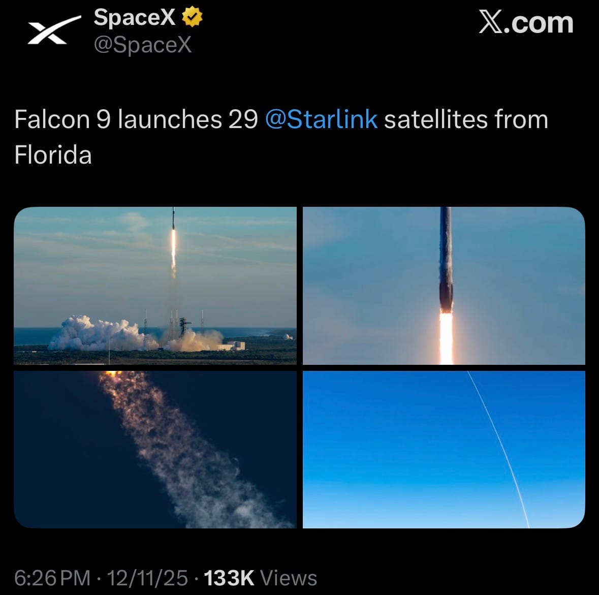 - On December 11, 2025, SpaceX launched the Starlink Group 6-90 mission using a Falcon 9 rocket from Space Launch Complex 40 at Cape Canaveral Space Force Station in Florida. Liftoff took place at 5:01 p.m. EST (22:01 UTC). The rocket followed a southeasterly path over the Atlantic Ocean, and the first stage (booster B1083 on its 16th flight) separated and landed on the droneship Just Read the Instructions about eight minutes later. This was SpaceX's 161st Falcon 9 launch of 2025, the 118th for Starlink, and the 300th orbital launch worldwide that year.