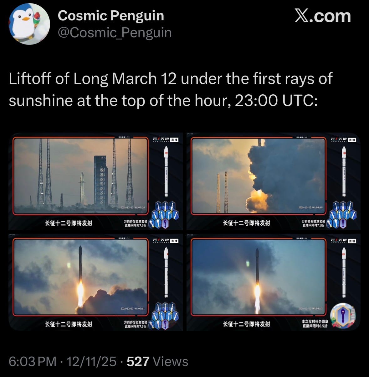 - On December 11, 2025, China launched the SatNet LEO Group 16 mission using a Long March 12 rocket from the Wenchang Space Launch Site in Hainan province, marking the 79th orbital launch from the country in 2025. Liftoff occurred at 4:30 p.m. Beijing Time (08:30 UTC), with the two-stage, kerosene-liquid oxygen vehicle ascending on a southeasterly trajectory toward low Earth orbit. The mission proceeded nominally through stage separation and payload deployment, as confirmed by the China Aerospace Science and Technology Corporation, with no reported anomalies and favorable weather at the coastal facility.