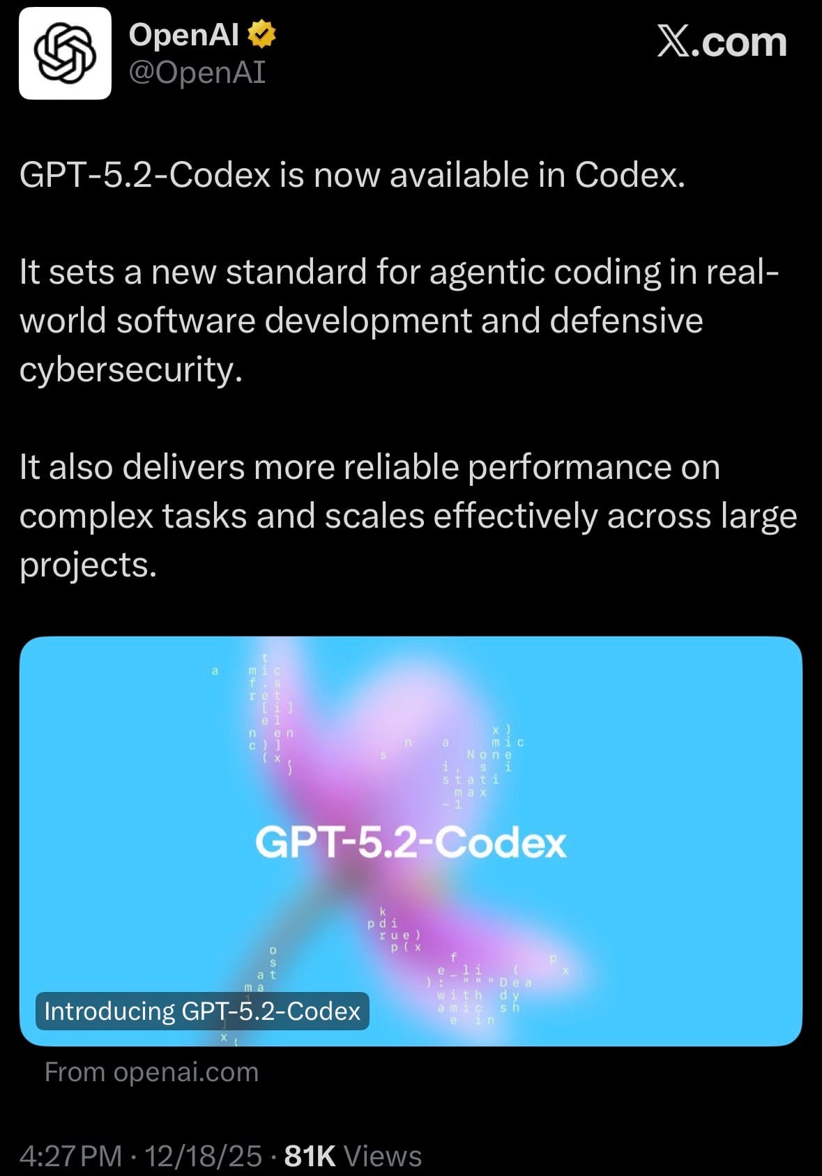 - On December 18, 2025, OpenAI released GPT-5.2-Codex, a specialized version of the GPT-5.2 model optimized for agentic coding within the Codex platform. The model is immediately available to all paid ChatGPT users across Codex surfaces, including the CLI, IDE extensions, cloud environment, GitHub integration, and code review tools. OpenAI highlighted its advancements in handling long-horizon tasks through context compaction, large-scale code changes like refactors and migrations, better performance in Windows environments, and significantly enhanced capabilities in defensive cybersecurity workflows.