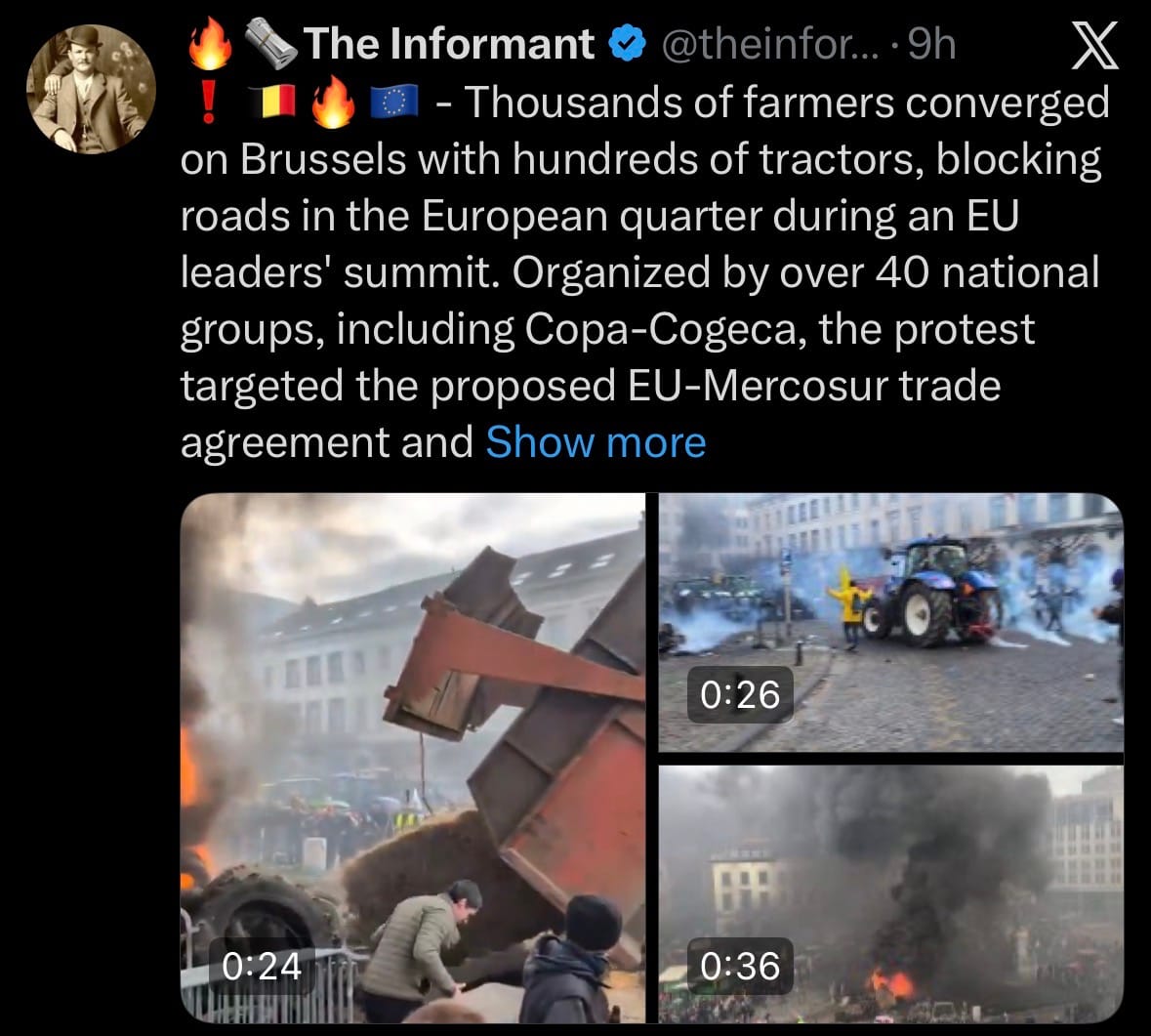 - On December 18, 2025, thousands of farmers—mainly from Belgium, the Netherlands, France, and neighboring countries—descended on Brussels with approximately 1,000 tractors, blocking major roads in the European quarter during an ongoing EU leaders' summit. Organized by over 40 farming groups including Copa-Cogeca, protesters burned tires, lit bonfires, threw eggs and potatoes, and clashed with riot police, who deployed tear gas and water cannons. The demonstration disrupted traffic and drew attention to agricultural grievances, resulting in EU leaders postponing the planned signing of the EU-Mercosur trade agreement until mid-January 2026.