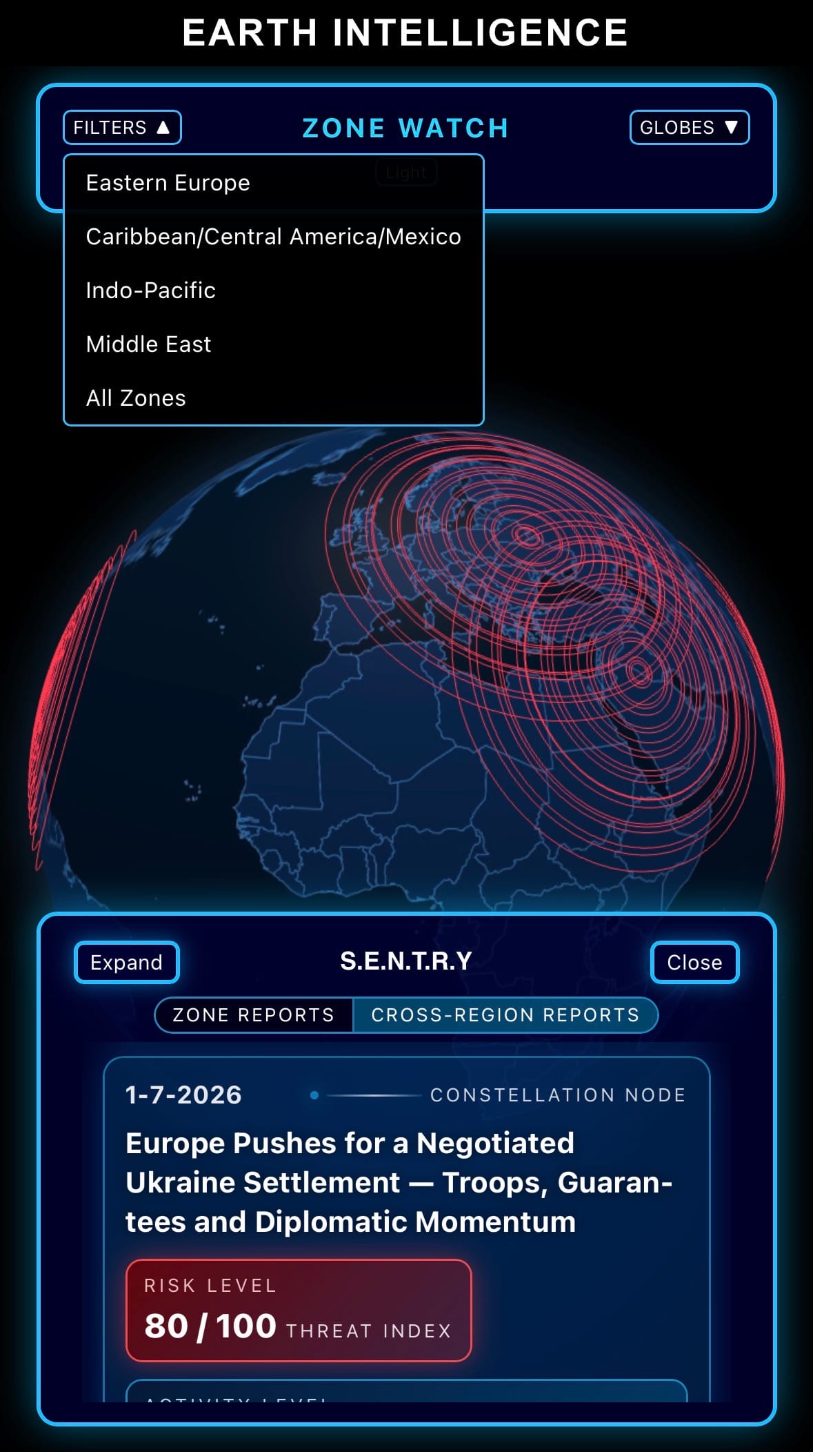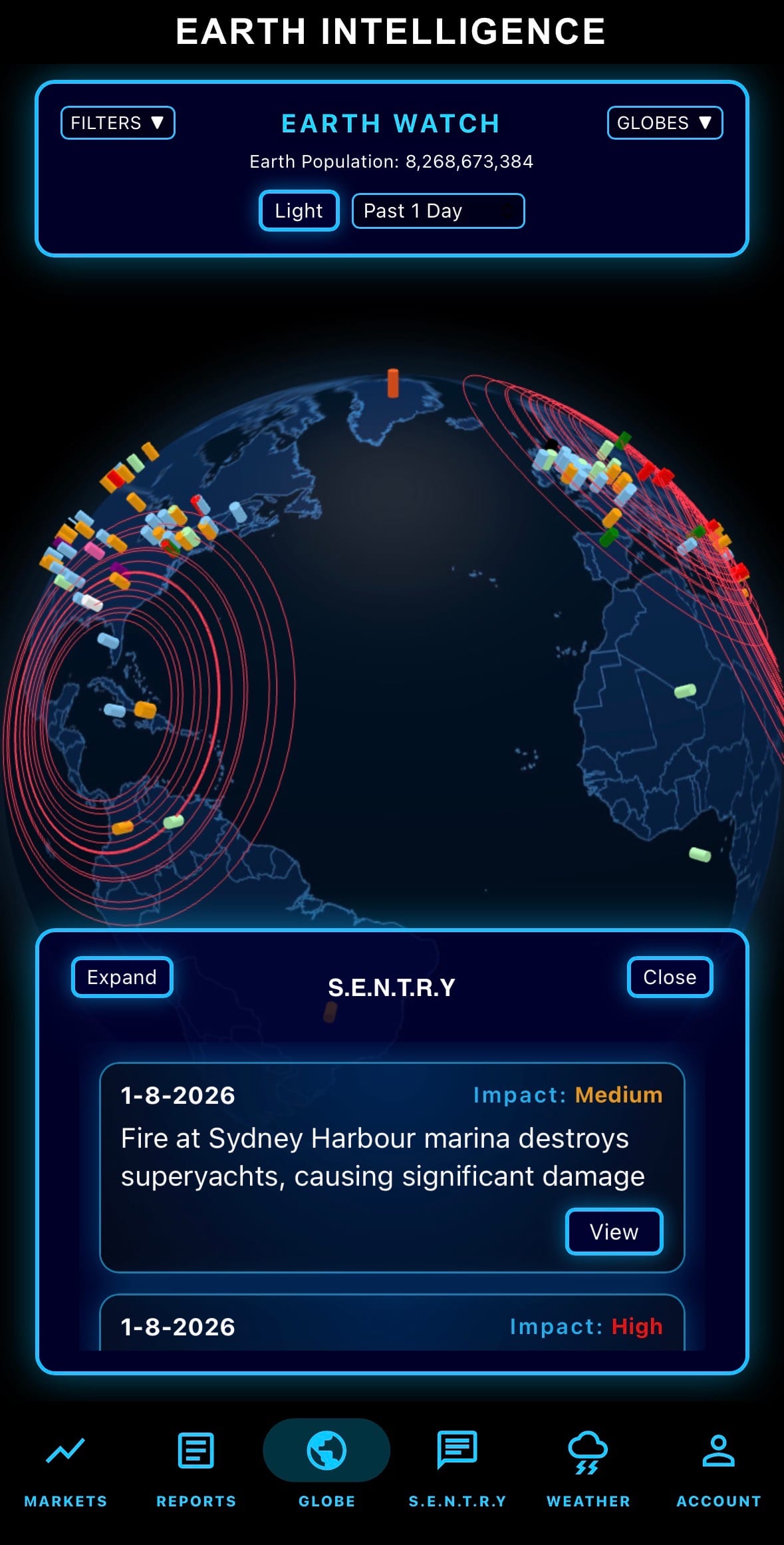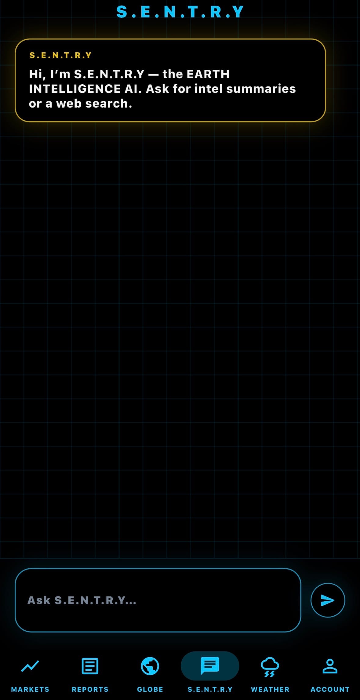 - We’ve just launched a major update to the EARTH INTELLIGENCE mobile app on both Apple and Android, marking a significant leap forward in real-time global intelligence delivery. This release introduces S.E.N.T.R.Y., our AI intelligence engine, now available as an interactive chatbot that allows you to ask questions, explore global events, and search the web directly inside the platform. We’ve also launched Weather Intelligence, enabling you to save a home location and view real-time conditions, hourly forecasts, and multi-day outlooks for any location on Earth. In addition, Market Intelligence and the Reports interface have been upgraded for improved clarity, performance, and situational awareness, while our S.E.N.T.R.Y. Intelligence event collection system now refreshes global events every 20 minutes.