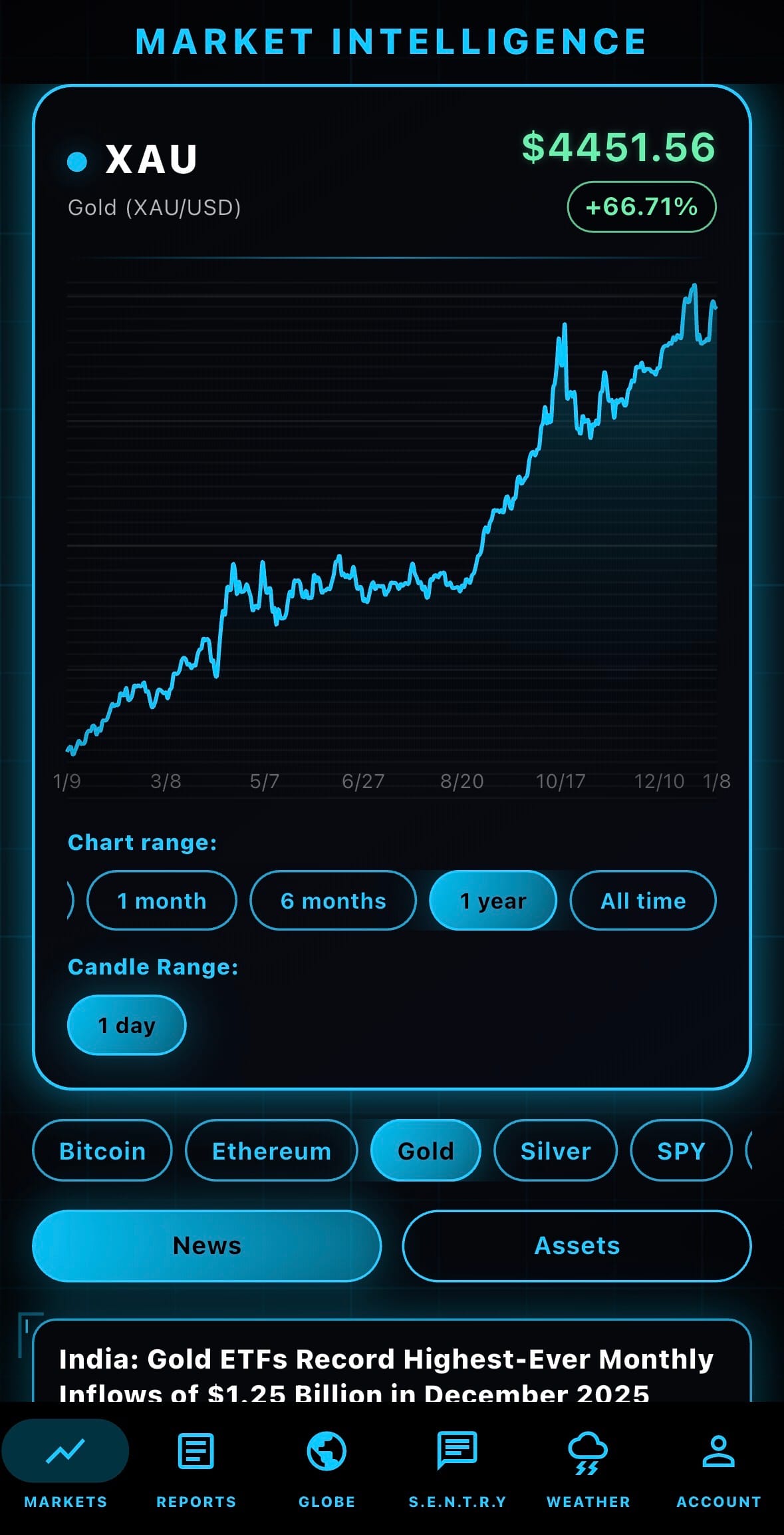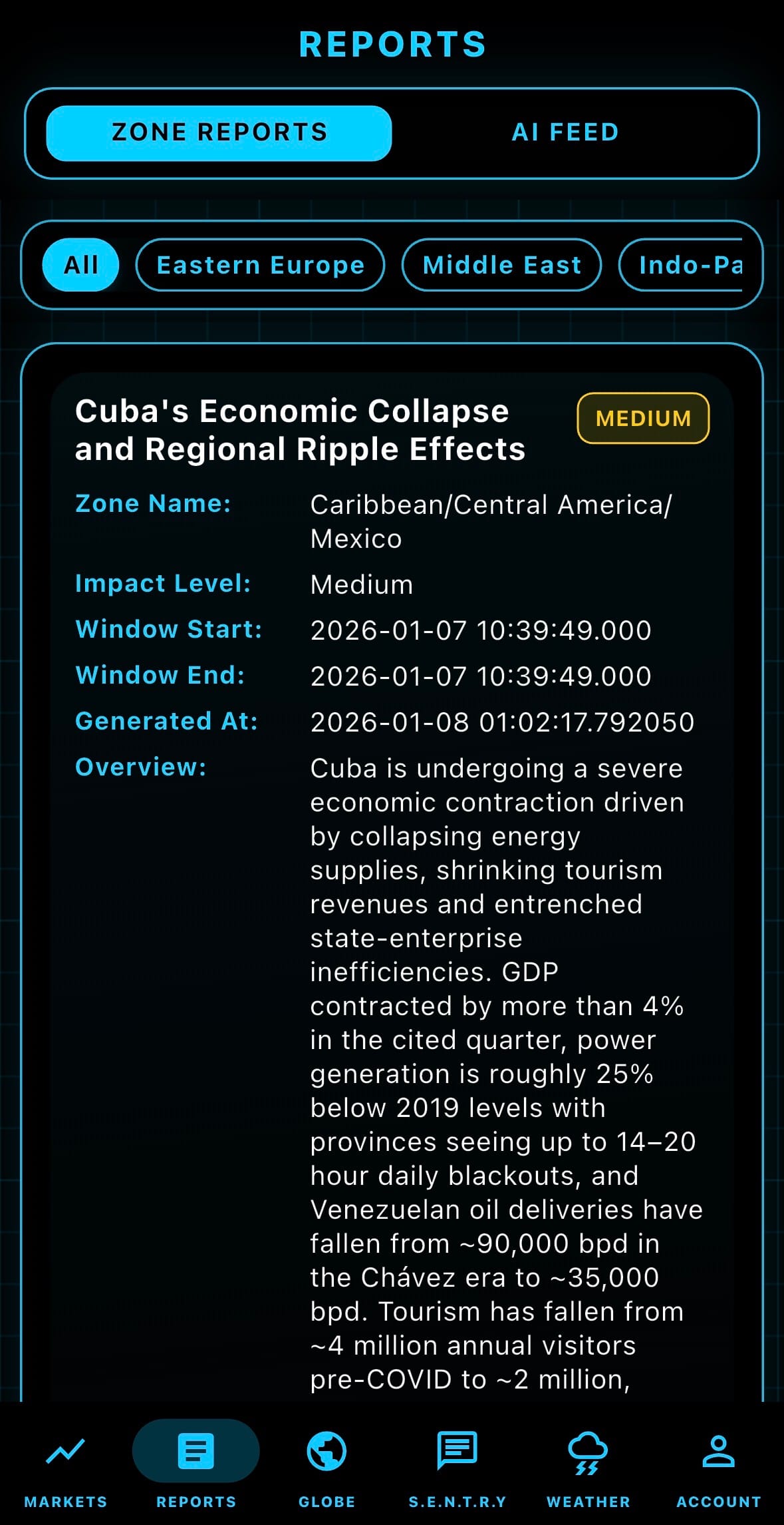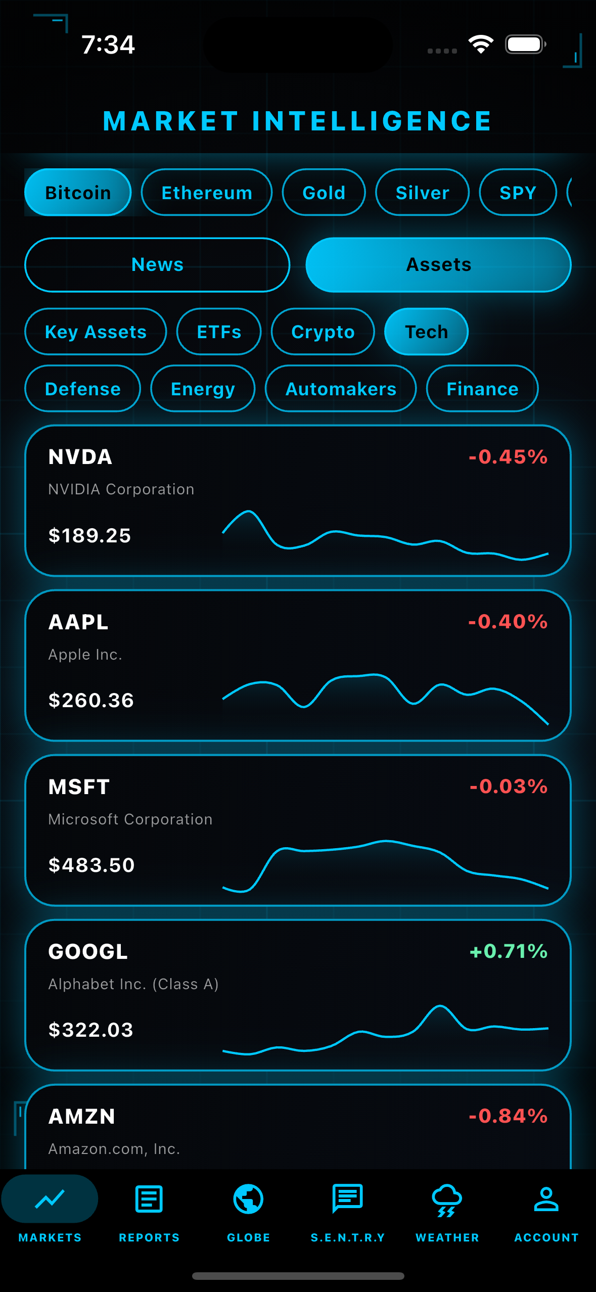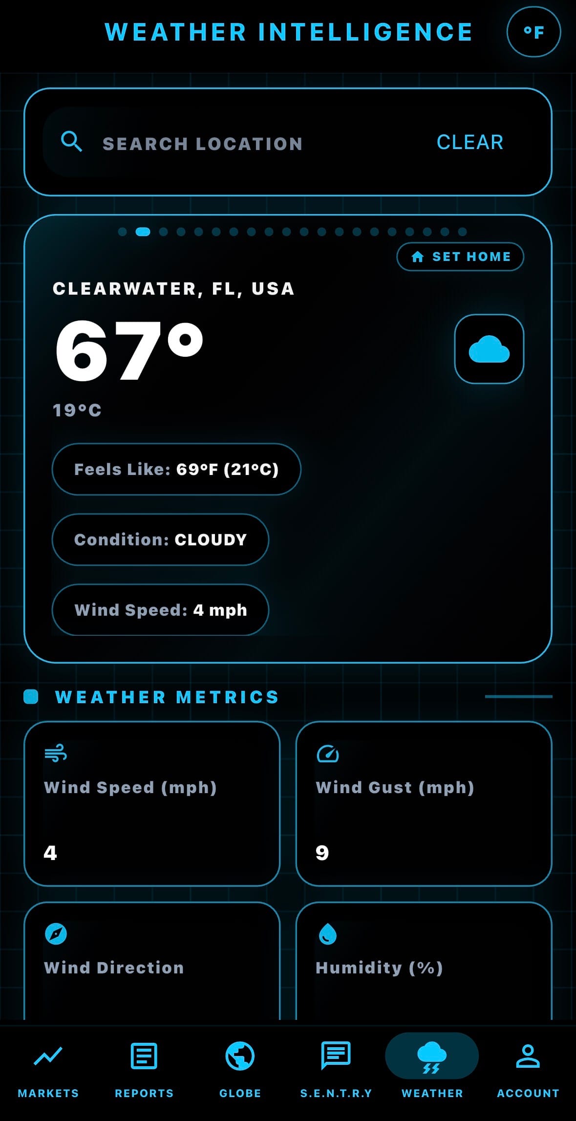 - We’ve just launched a major update to the EARTH INTELLIGENCE mobile app on both Apple and Android, marking a significant leap forward in real-time global intelligence delivery. This release introduces S.E.N.T.R.Y., our AI intelligence engine, now available as an interactive chatbot that allows you to ask questions, explore global events, and search the web directly inside the platform. We’ve also launched Weather Intelligence, enabling you to save a home location and view real-time conditions, hourly forecasts, and multi-day outlooks for any location on Earth. In addition, Market Intelligence and the Reports interface have been upgraded for improved clarity, performance, and situational awareness, while our S.E.N.T.R.Y. Intelligence event collection system now refreshes global events every 20 minutes.