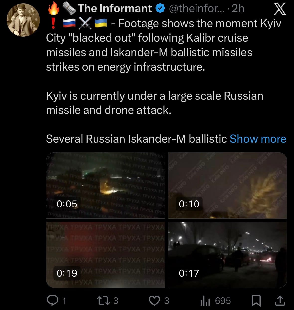 - On January 8-9, 2026, Russian forces launched a large-scale missile and drone attack on Kyiv, Ukraine, targeting energy infrastructure and causing widespread blackouts across the city. Footage captured power outages in central districts following strikes by Iskander-M ballistic missiles and Kalibr cruise missiles on key facilities, including the CHP-4, CHP-5, and CHP-6 power plants. A Geran-2 (Shahed-136) drone also struck a residential apartment building, resulting in civilian injuries and structural damage; Ukrainian emergency services reported at least two deaths and over 20 wounded from the overall barrage, with air raid sirens sounding for several hours.