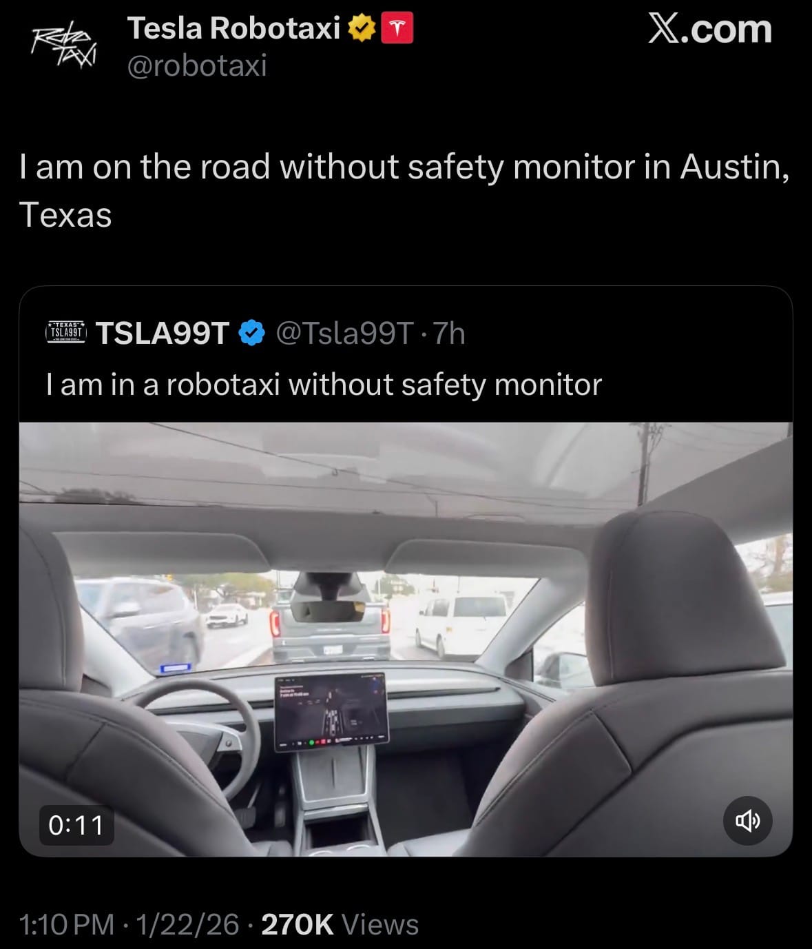 - On January 22, 2026, Tesla launched unsupervised Robotaxi rides in Austin, Texas, allowing passengers to hail and ride in a Tesla Model Y with no human safety driver or monitor in the vehicle. The service is now publicly available through the Tesla app in Austin, with early user-shared videos showing empty front seats during rides. The rollout begins with a small number of fully unsupervised vehicles operating alongside the existing fleet that still includes safety-monitored cars, with plans to gradually increase the proportion of driverless rides.