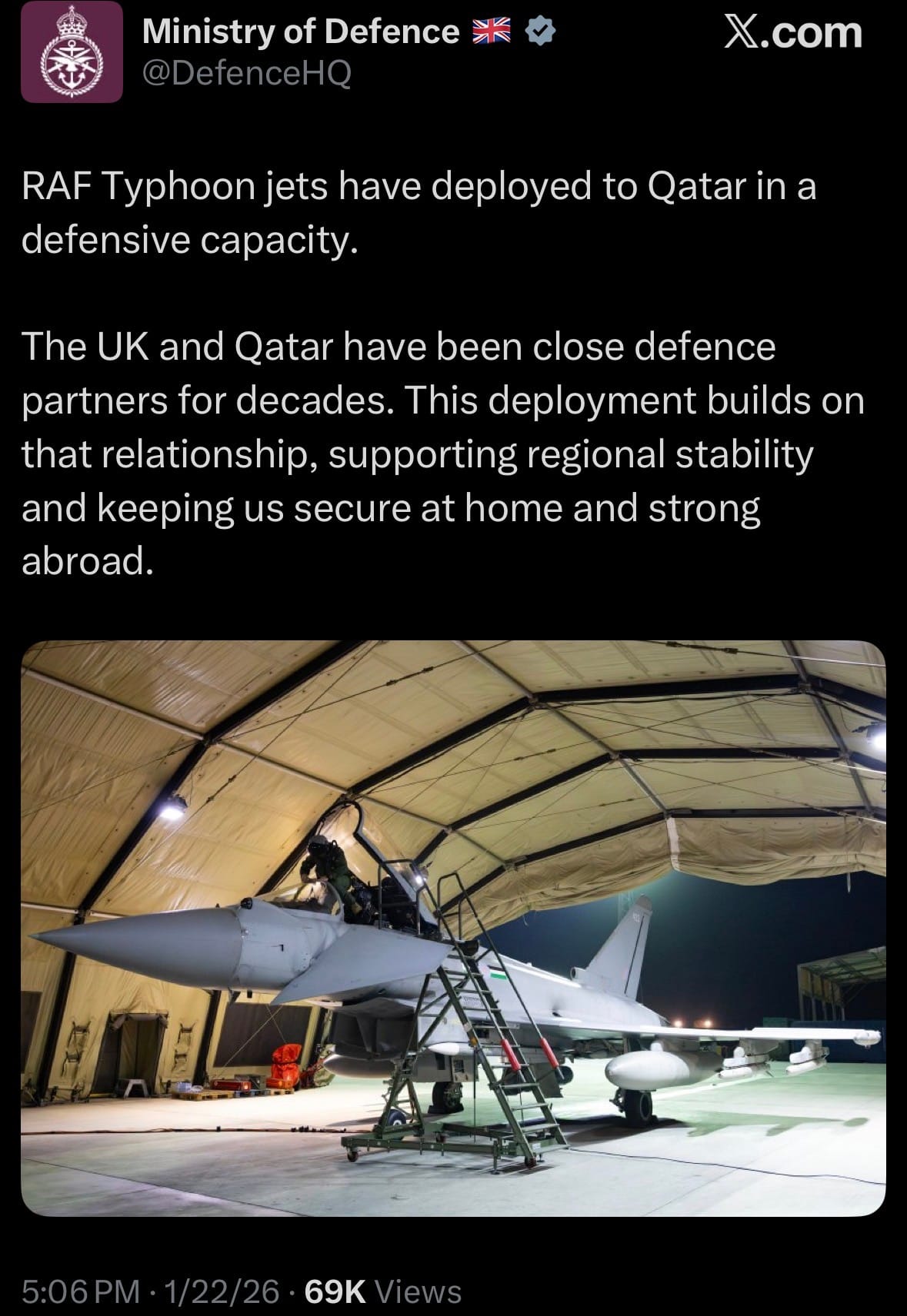 - On January 22, 2026, the UK Ministry of Defence announced that Royal Air Force (RAF) Typhoon jets from the joint UK-Qatar No. 12 Squadron have deployed to Qatar in a defensive capacity. The deployment, made at the request of the Qatari government and under the UK-Qatar Defence Assurance Agreement, supports regional stability amid heightened tensions in the Gulf area.