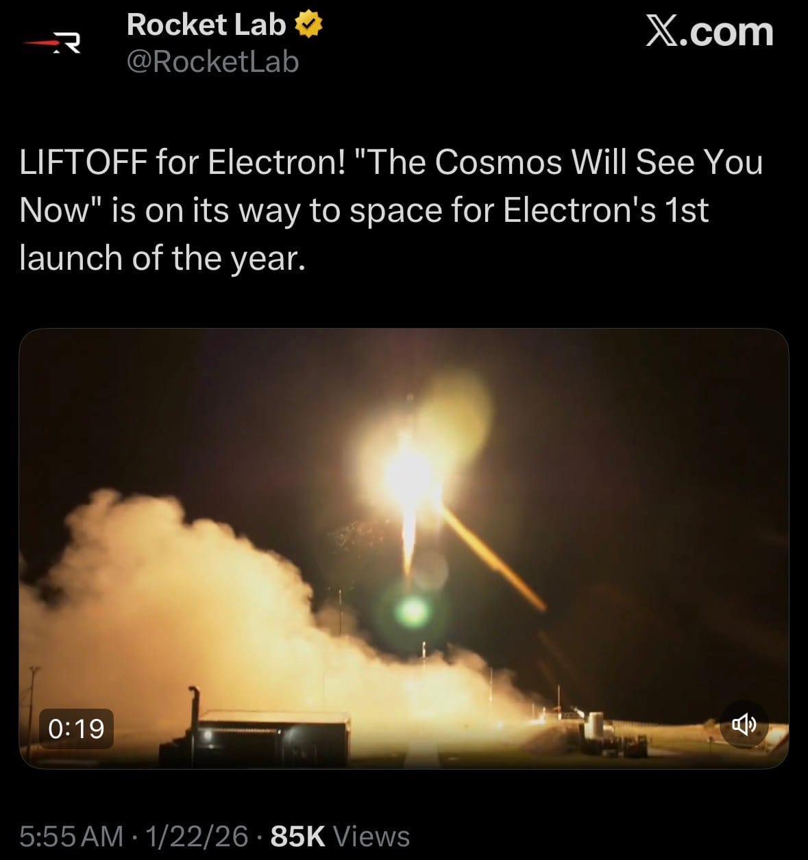 - On January 22, 2026, Rocket Lab successfully launched its first Electron rocket mission of the year, named "The Cosmos Will See You Now," from Launch Complex 1 at Mahia Peninsula, New Zealand, at 5:52 a.m. EST (10:52 UTC / 11:52 p.m. local time). The mission deployed two satellites into a circular polar orbit at approximately 1,050 km altitude about 69 minutes after liftoff, marking the first satellites in Open Cosmos' planned low-Earth orbit (LEO) telecom constellation.