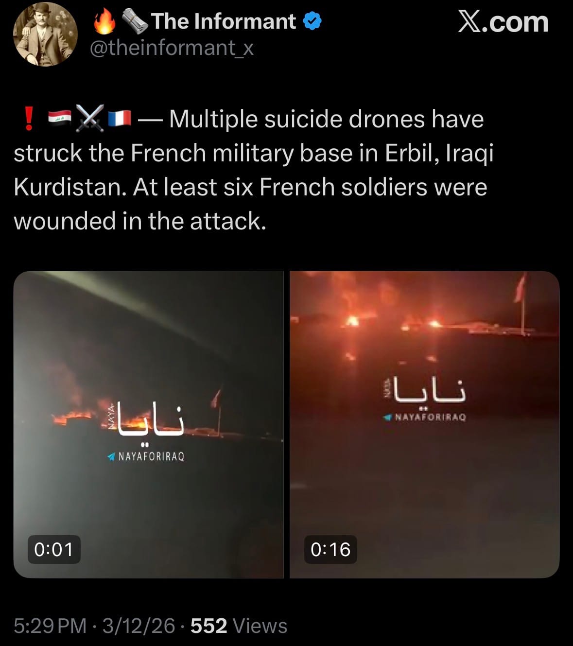 - As of March 12, 2026, multiple suicide drones (also described as kamikaze or one-way attack drones) struck a joint Peshmerga-French military base in the Makhmour area of Erbil province, Iraqi Kurdistan, late Thursday evening. At least six French soldiers were wounded in the attack, with injuries reported as light to moderate; no Peshmerga personnel were harmed, and the soldiers received immediate medical attention while base operations continued.
