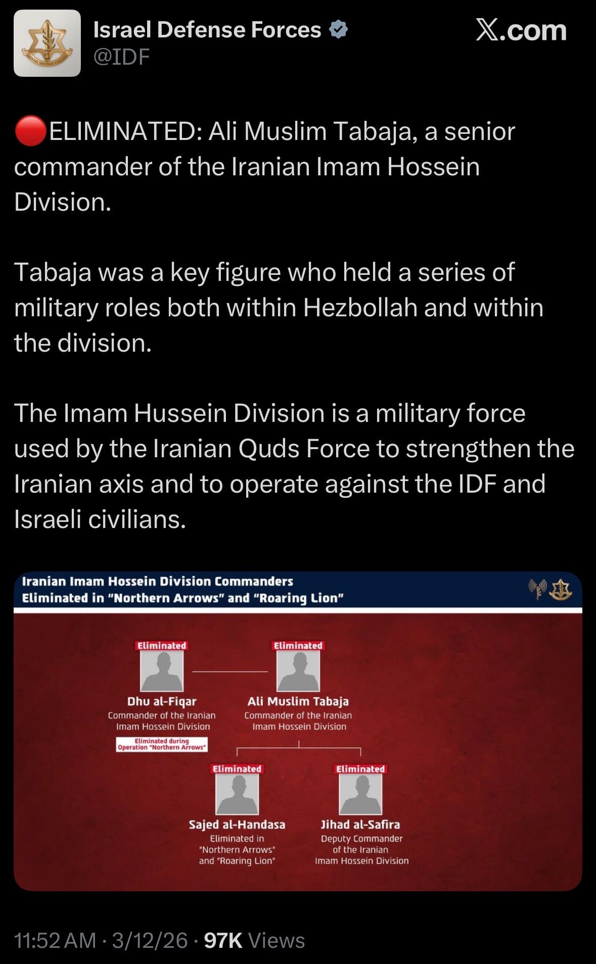 - As of March 12, 2026, the Israel Defense Forces (IDF) announced that an overnight Israeli Air Force strike in Lebanon eliminated Ali Muslim Tabaja, the senior commander of Iran's Imam Hossein Division (also known as Imam Hussein Division), along with several other senior operatives from the unit. Tabaja, who had previously served as deputy commander, took over leadership after his predecessor, Dhu al-Fiqar, was killed in an earlier Israeli operation.