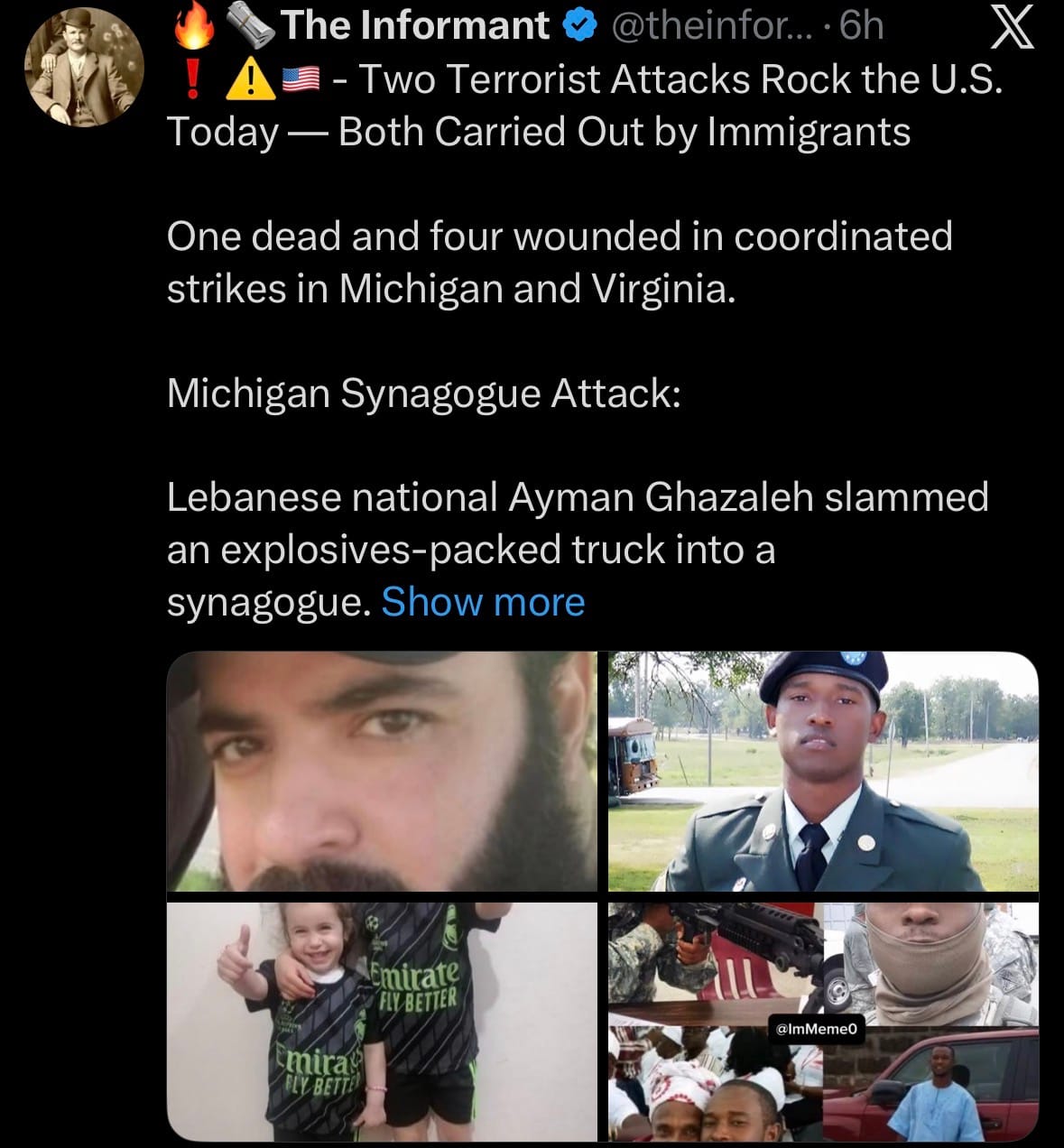 - Both incidents are under investigation as potential terrorism linked to the Middle East conflict. The Michigan attacker had posted about family killed in an Israeli strike in Lebanon, while Jalloh had a known radicalization history and was released from prison in 2024. No direct link between the attacks has been confirmed, but they have fueled intense debate over immigration vetting, domestic terrorism, and national security.
