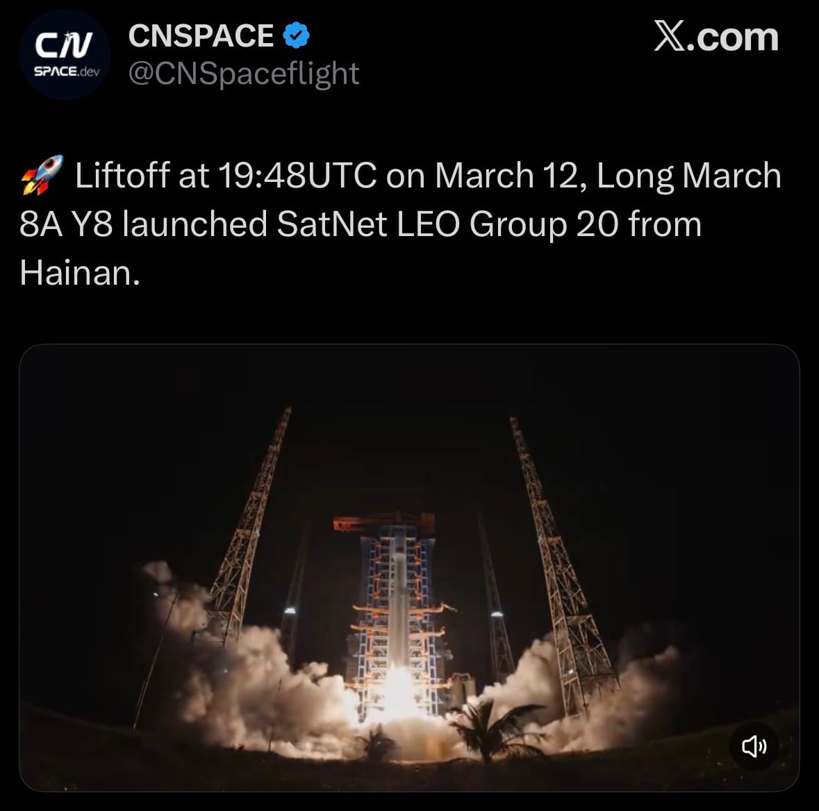 - As of March 13, 2026, China successfully launched SatNet LEO Group 20 (also known as Guowang/Satellite Internet LEO Group 20) using a Long March 8A rocket from Commercial LC-1 at the Wenchang Satellite Launch Center in Hainan Province.