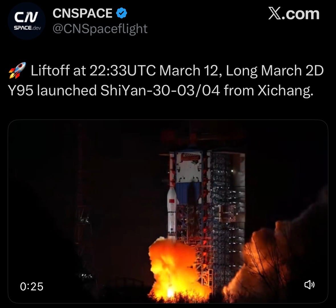 - As of March 13, 2026, China successfully launched the Shiyan-30 03 and Shiyan-30 04 (试验三十号卫星03、04) satellites aboard a Long March-2D rocket from the Xichang Satellite Launch Center in Sichuan province.