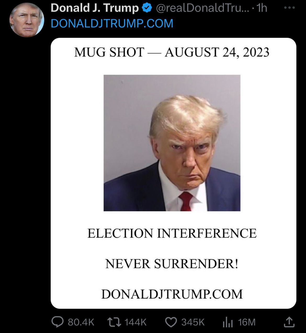 - Trump subsequently used this mug shot on his X account and Truth Social, labeled "election interference" and "never surrender." The booking was swift, approximately 30 minutes, after agreeing to a $200,000 bond earlier.