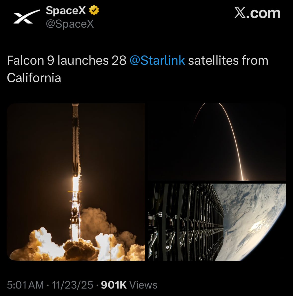 - On November 23, 2025, SpaceX carried out its 151st Falcon 9 launch of the year, placing 28 Starlink satellites into low Earth orbit as part of the Starlink 11-30 mission from Vandenberg Space Force Base in California. The mission involved a new Falcon 9 booster, B1100, on its initial flight, with liftoff at approximately 3:48 a.m. ET and the first stage landing on a drone ship in the Pacific Ocean.