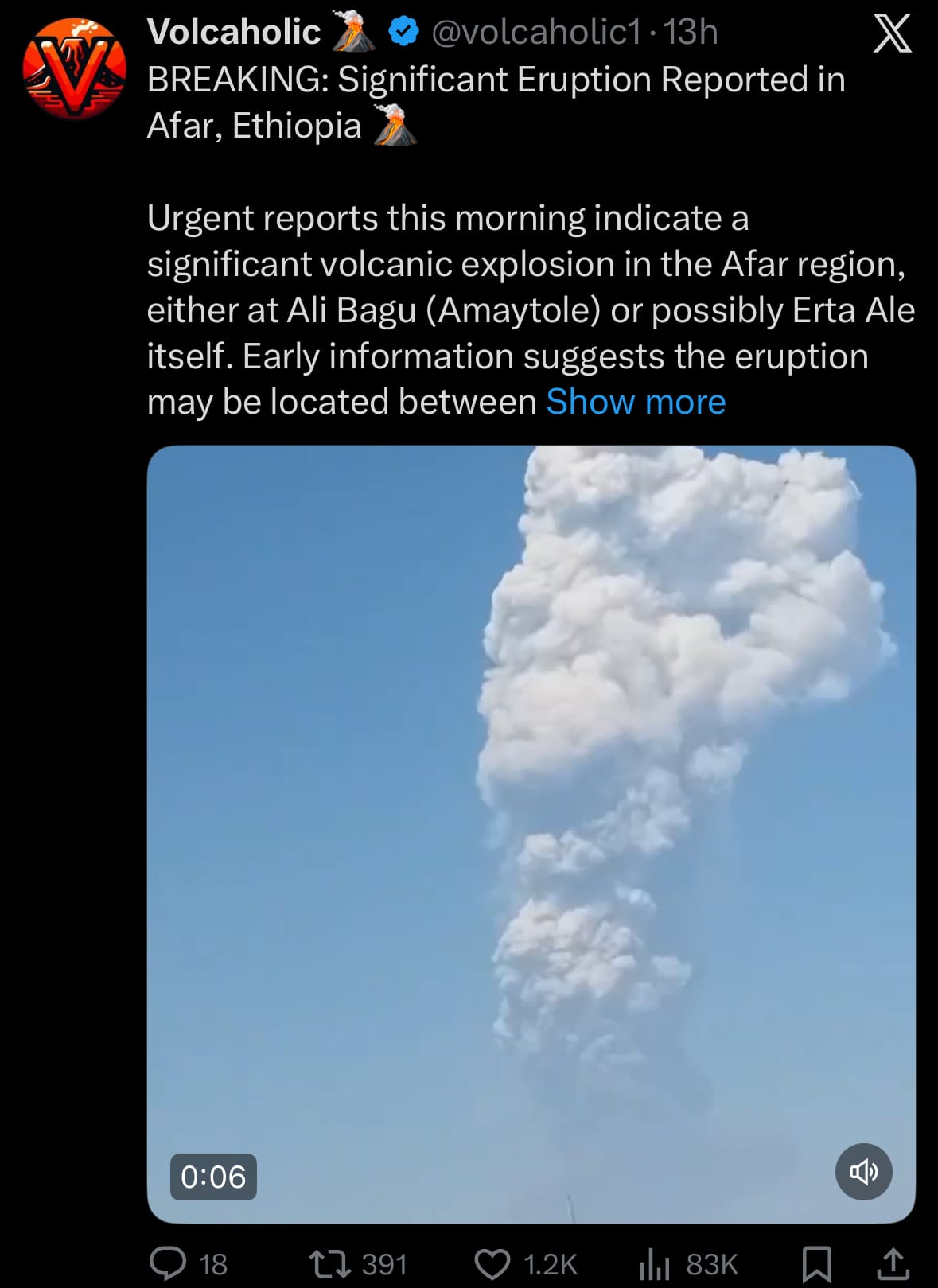 - On November 23, 2025, an explosive eruption occurred at the Hayli Gubbi shield volcano in Ethiopia's Afar region, southeast of the well-known Erta Ale volcano, marking the first recorded activity at this site in potentially over 10,000 years. The eruption began around 8:30 a.m. local time, producing a large ash plume that rose to approximately 10-15 kilometers in altitude and drifted eastward over the Red Sea toward Yemen and Oman, with reports of volcanic lightning observed during the event. Initial accounts from local residents and satellite imagery confirmed the ash cloud's visibility from distant areas like the Tigray mountains, while authorities deployed experts to monitor the situation and urged nearby communities to take precautions or evacuate due to falling ash and potential hazards.
