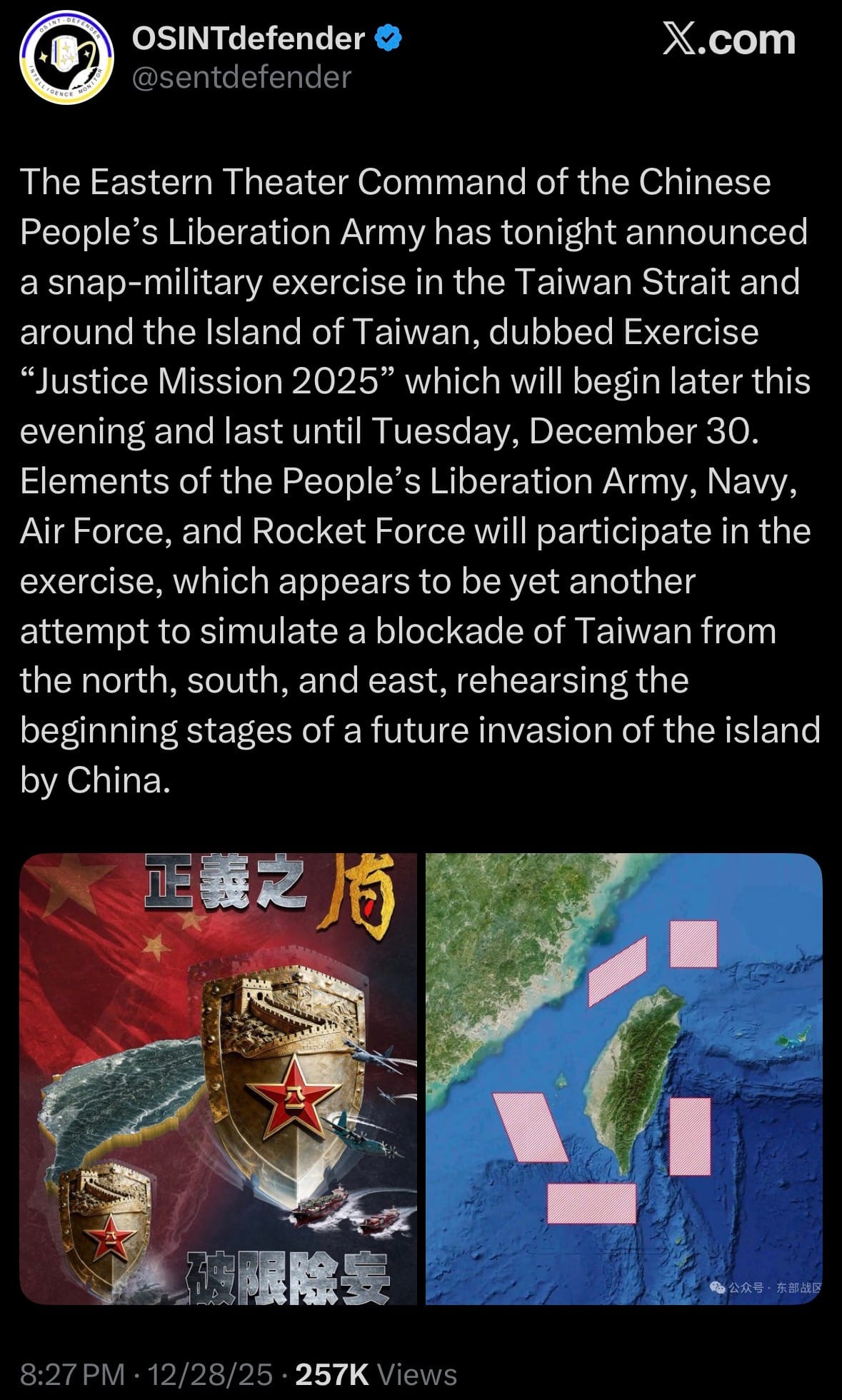 - On December 29, 2025, the People's Liberation Army (PLA) Eastern Theater Command launched large-scale joint military exercises code-named Justice Mission 2025 in the Taiwan Strait and surrounding areas north, southwest, southeast, and east of Taiwan Island. Involving army, navy, air force, and rocket force units, the drills include sea-air combat readiness patrols, joint seizure of battlefield superiority, simulated blockades of key ports (such as Keelung and Kaohsiung), strikes on targets, and all-dimensional deterrence operations. Live-fire activities were scheduled in designated zones on December 30, with airspace and maritime restrictions imposed.