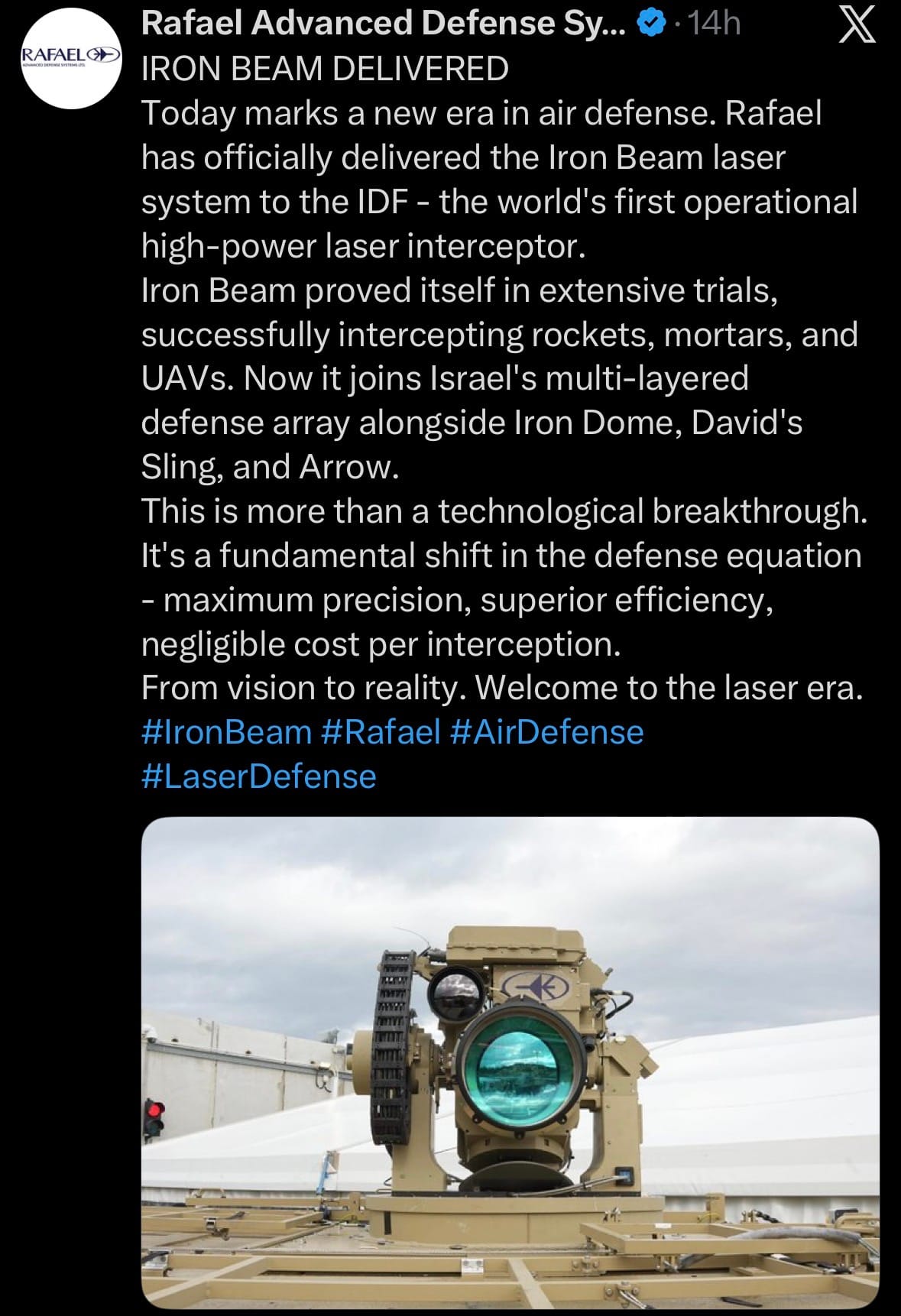 - On December 28, 2025, Israel's Ministry of Defense and Rafael Advanced Defense Systems officially delivered the first operational Iron Beam high-power laser air defense system to the Israel Defense Forces during a handover ceremony at Rafael's headquarters in northern Israel. Attended by Defense Minister Israel Katz, senior IDF officials, and Rafael leadership, the event marked the system's transition to active service within the Israeli Air Force. The 100-kW class laser, developed primarily by Rafael with contributions from Elbit Systems (laser source) and others, successfully intercepted rockets, mortars, and UAVs in extensive testing, including simulated combat scenarios.