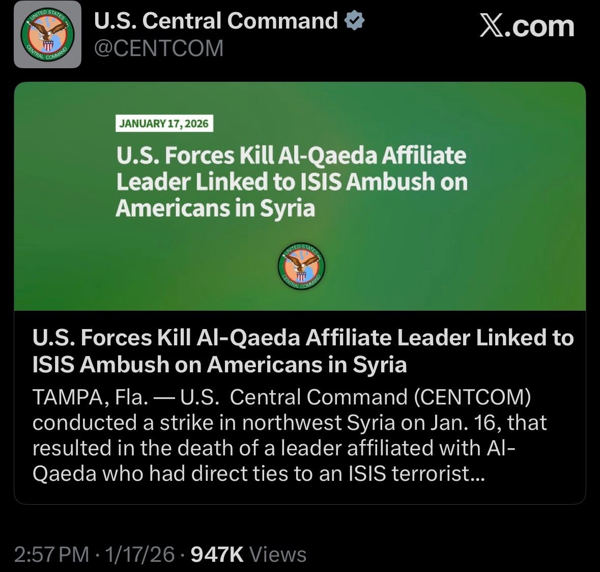 - On January 17, 2026, U.S. Central Command (CENTCOM) announced that its forces conducted a precision strike in northwest Syria on January 16, killing Bilal Hasan al-Jasim, an Al-Qaeda-affiliated terrorist leader with direct ties to the ISIS operative responsible for the December 13, 2025, ambush in Palmyra, Syria. That attack killed two U.S. Army soldiers (Sgt. Edgar Brian Torres-Tovar and Sgt. William Nathaniel Howard) and one American civilian interpreter, while wounding three others.
