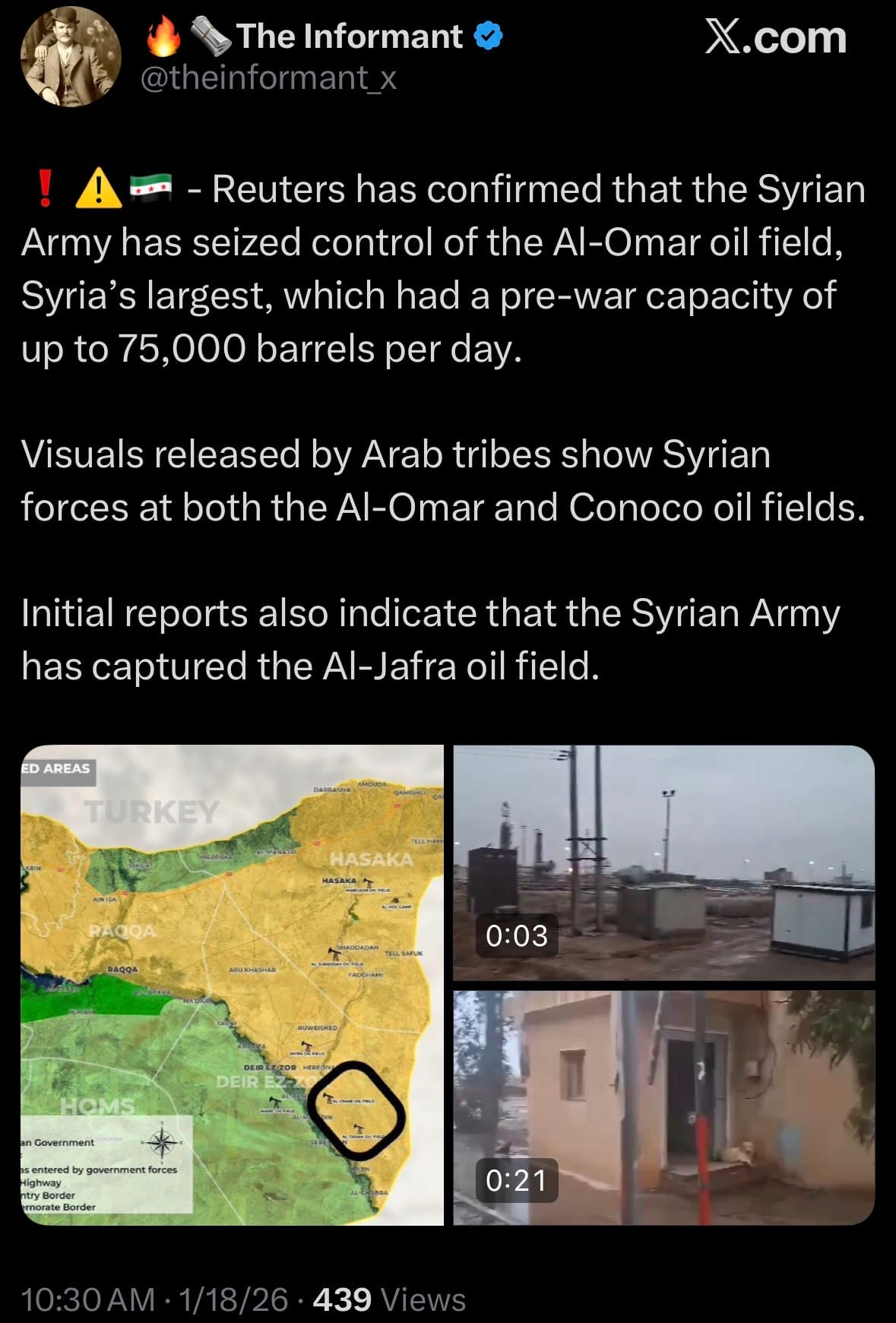 - On January 18, 2026, Syrian government forces took control of the Al-Omar oil field (Syria’s largest, pre-war capacity up to 75,000 barrels per day) and the Conoco gas field in eastern Deir ez-Zor province after the U.S.-backed Syrian Democratic Forces (SDF) withdrew. Syrian officials, Reuters, and the Syrian Observatory for Human Rights confirmed the takeover; visuals from allied Arab tribes showed government troops at both sites. Initial reports also suggest the Al-Jafra oil field was captured, though this is less verified. These gains followed rapid advances over the previous 24-48 hours, including the seizure of Tabqa city and its dam, plus towns such as al-Shuhail, Busayra, Baghouz, Hatla, Gharanij, Muhaymidah, al-Hawaij, Dhiban, Abu Hamam, Susah, Shafa, and others along the eastern Euphrates. With Arab tribal support, Damascus now controls most of Deir ez-Zor province—vital for oil, gas, and wheat—representing a major economic and territorial setback for the SDF amid ongoing talks and clashes. No significant casualties were reported from the oil field takeovers.