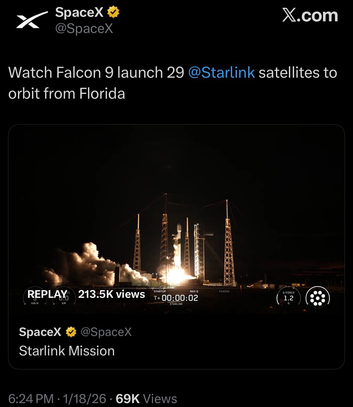 - On January 18, 2026, SpaceX successfully launched the Starlink Group 6-100 mission using a Falcon 9 rocket from Space Launch Complex 40 at Cape Canaveral Space Force Station in Florida. The rocket lifted off at 6:31 PM EST, deploying 29 Starlink V2 Mini satellites into low Earth orbit to expand the company's global broadband constellation. The first-stage booster landed successfully on a droneship in the Atlantic, marking another reuse milestone.
