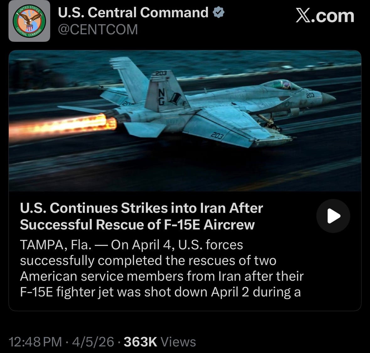 - On April 4, 2026, U.S. forces successfully rescued two American service members after their F-15E Strike Eagle fighter jet was shot down over Iran on April 2 during a combat mission.