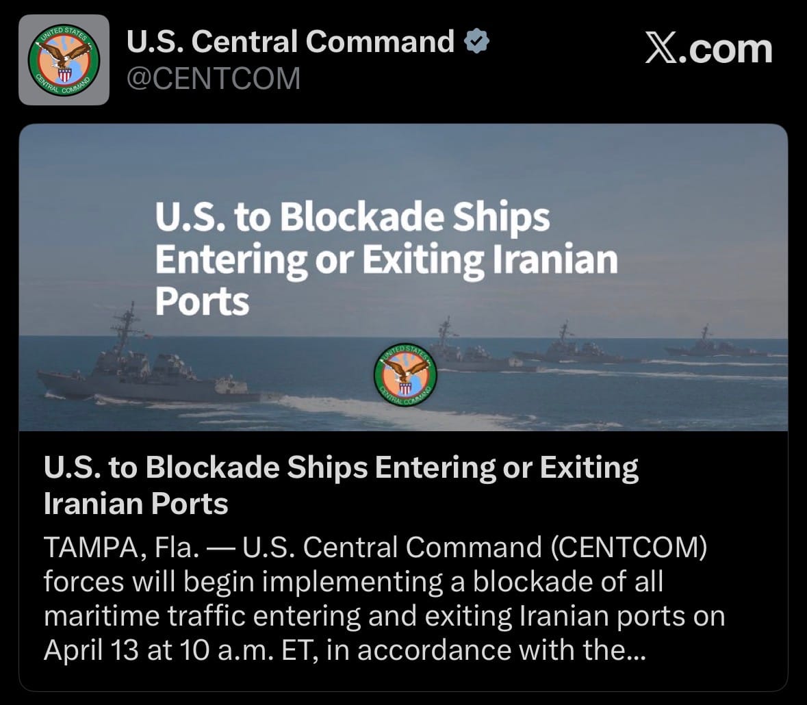 - This creates a rare dual blockade situation: Iran continues its own checkpoint system and selective blockade near Larak Island, while the U.S. Navy simultaneously enforces its own blockade to prevent ships from reaching Iran. Both sides are currently blocking traffic in the critical waterway, further strangling global oil and LNG flows. Oil prices surged sharply following the announcement.