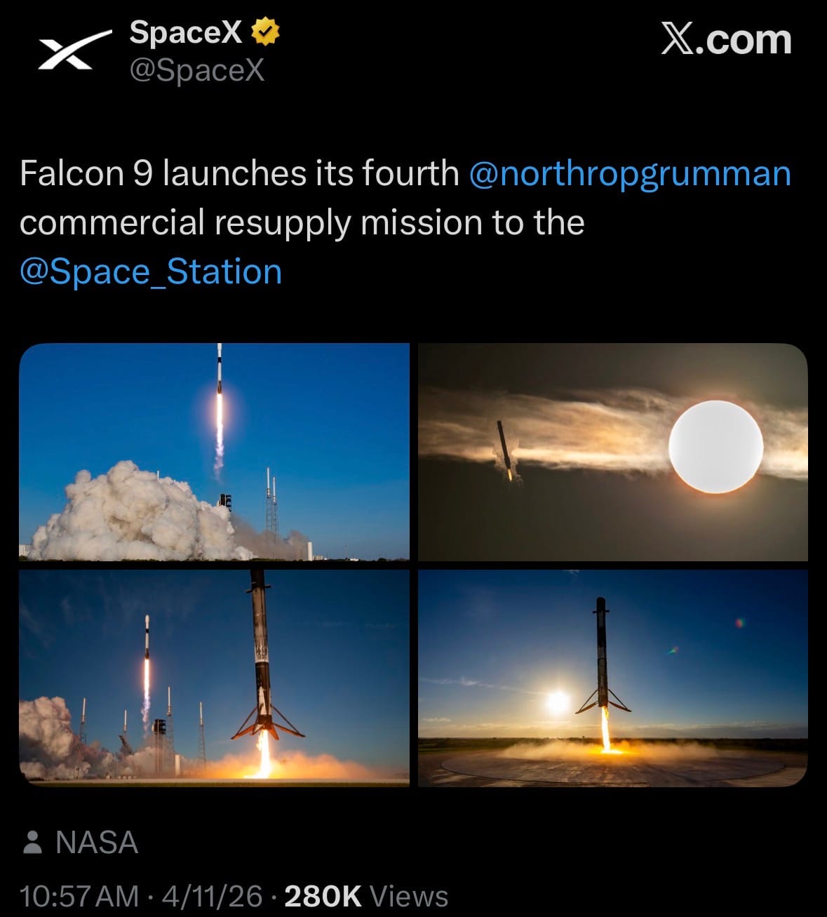 - Also on April 11, SpaceX launched another Falcon 9 from Cape Canaveral in Florida, carrying Northrop Grumman’s Cygnus NG-24 cargo spacecraft with supplies and experiments to the International Space Station.