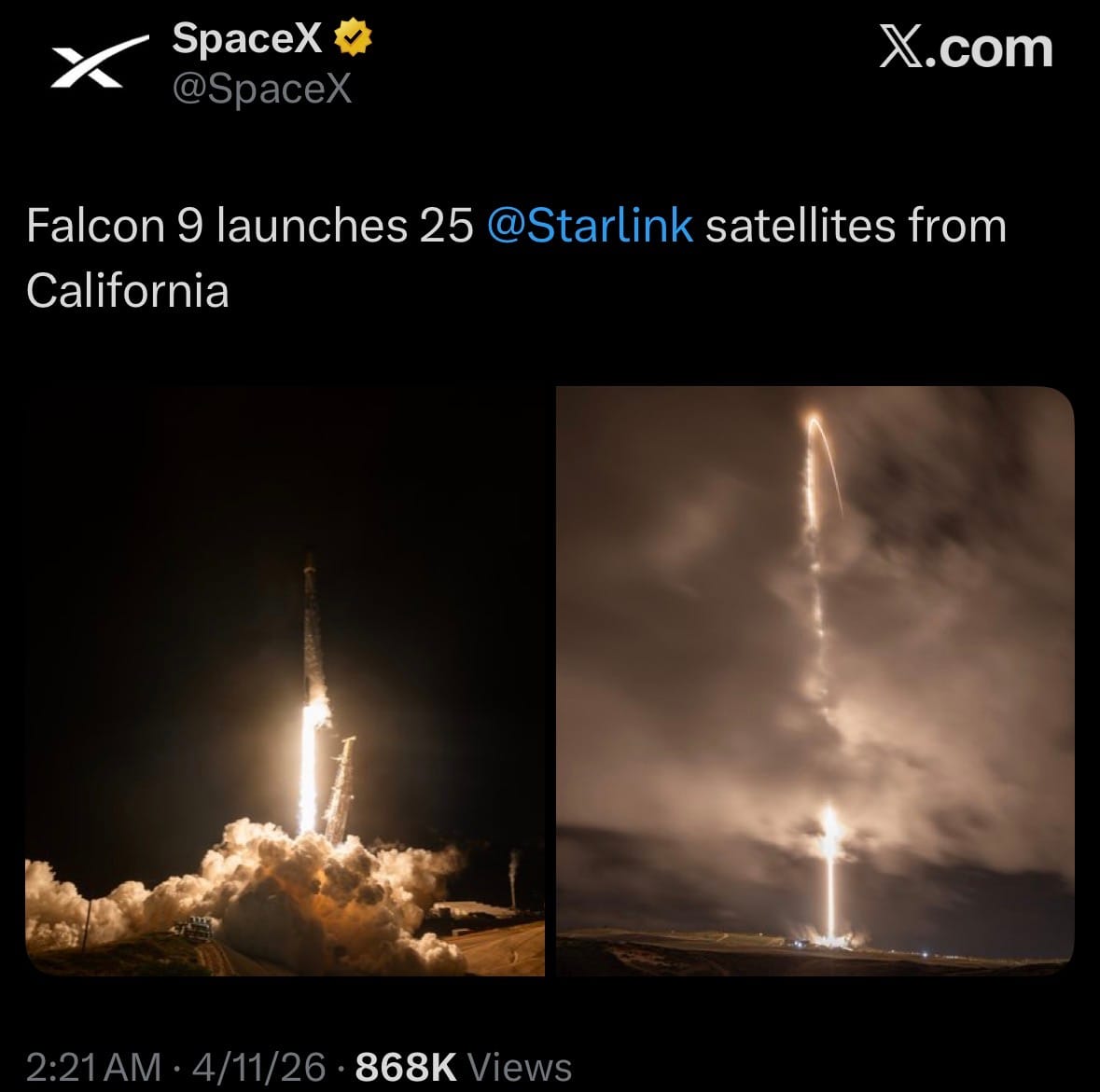 - On April 10, 2026, SpaceX launched a Falcon 9 rocket from Vandenberg Space Force Base in California, successfully deploying 25 Starlink satellites (Group 17-21) into low-Earth orbit.