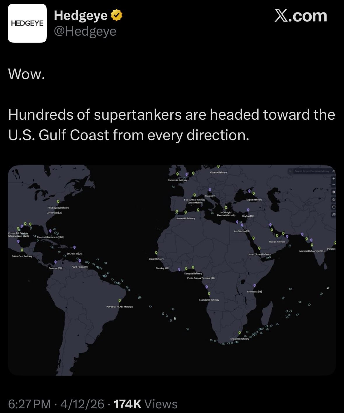 - Following the U.S. announcement of a naval blockade of the Strait of Hormuz, hundreds of empty supertankers are now converging on the U.S. Gulf Coast from multiple directions, with many vessels rerouting mid-ocean from Europe, Asia, and other regions.