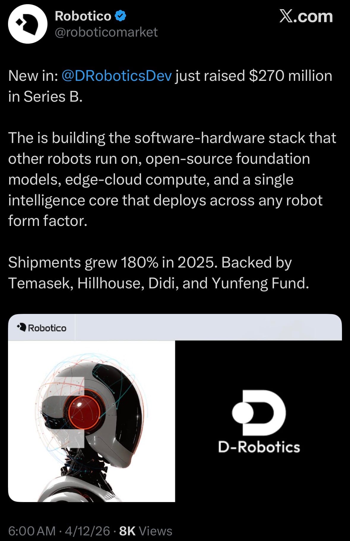 - This latest investment highlights the broader 2025–2026 trend of surging capital flowing into foundational robotics platforms and enabling technologies, as the industry sees rapid shipment growth (like D-Robotics’ 180% increase last year) and strong backing from major investors including Temasek, Hillhouse, Didi, and Yunfeng.