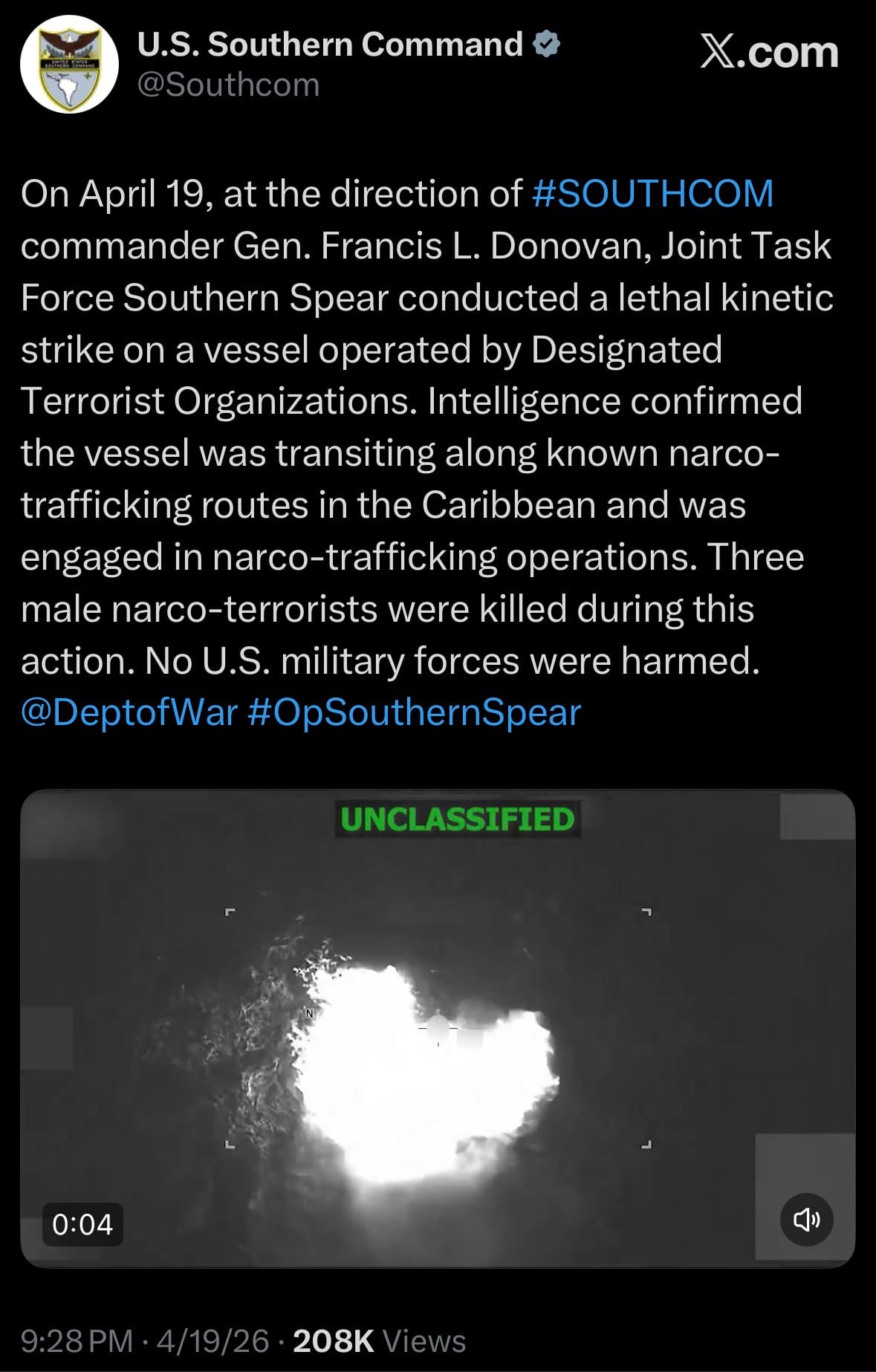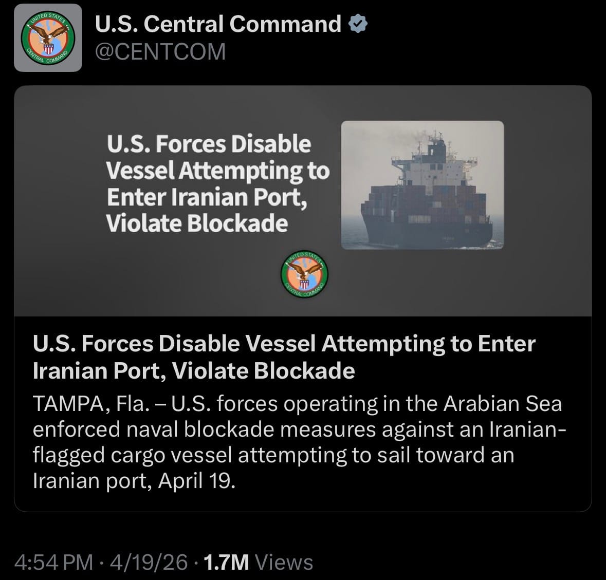 - The U.S. continues its naval blockade of Iranian ports, while Iran has re-closed the strait in retaliation and is actively turning back or firing on vessels attempting to transit. On April 19, the U.S. Navy fired on and seized the Iranian-flagged cargo vessel MV Touska after it ignored repeated warnings — the first forcible interception since the operation began. The situation remains highly tense with both sides on high alert.