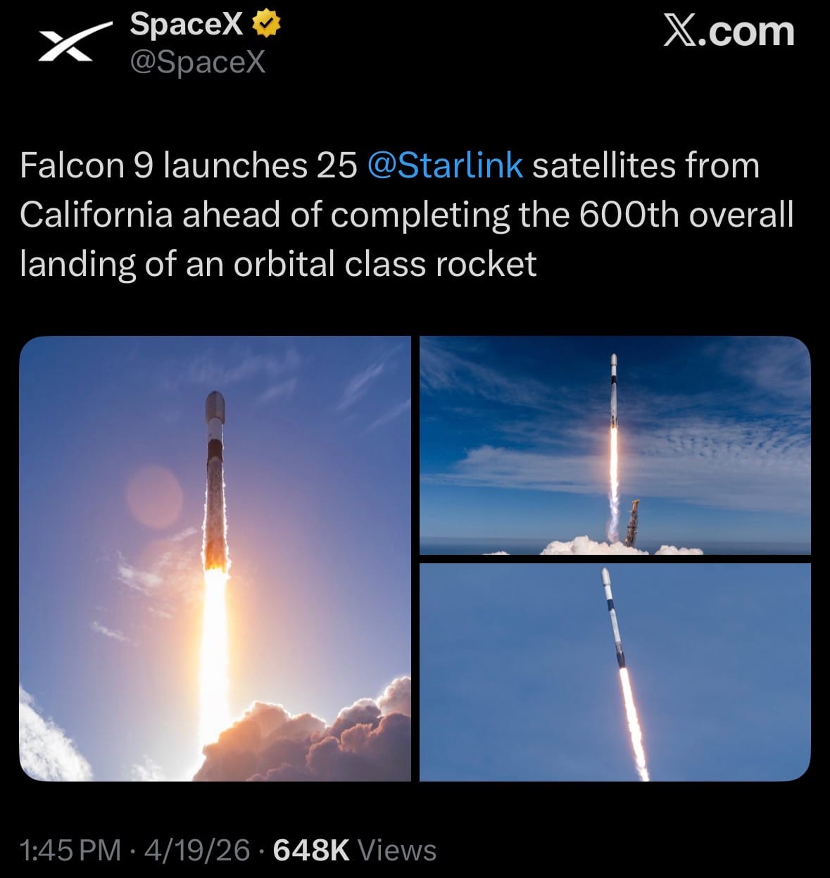- On April 19, 2026, SpaceX successfully launched Starlink Group 17-22 from Vandenberg Space Force Base in California, deploying 25 Starlink v2 Mini satellites into a sun-synchronous low-Earth orbit to expand global broadband coverage.