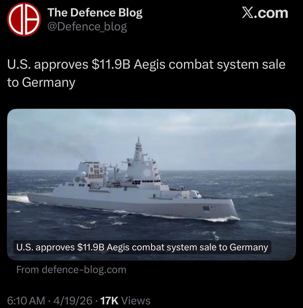 - On April 17, 2026, the U.S. State Department approved a potential $11.9 billion Foreign Military Sale to Germany for eight shipsets of the Aegis-based Integrated Combat System, including AN/SPY-6 radars, MK 41 Vertical Launch Systems, and related weapons and support equipment.