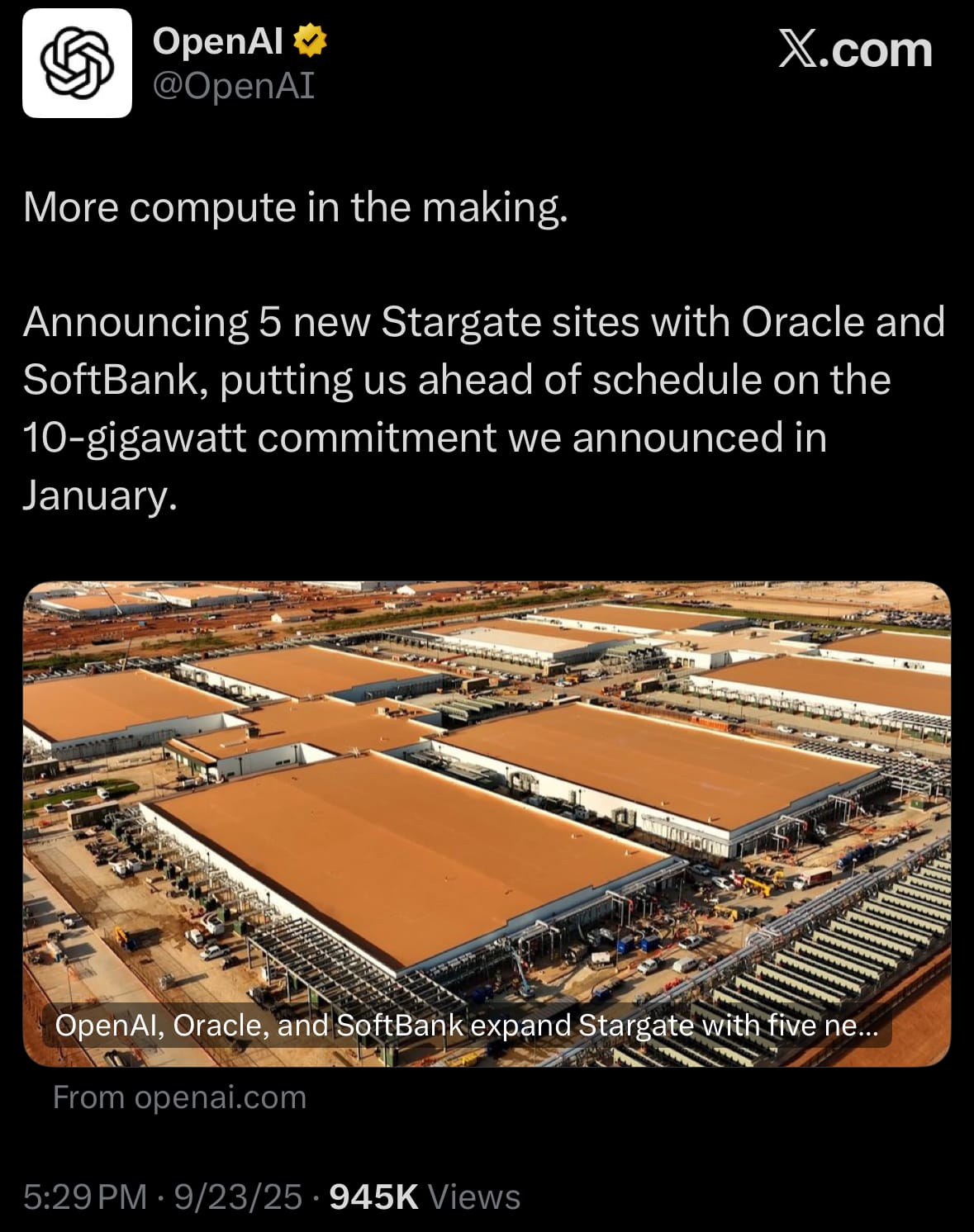 - On September 23, 2025, OpenAI, in partnership with Oracle and SoftBank, announced the addition of five new AI data center sites to the Stargate project, accelerating its ambitious infrastructure buildout across the United States. The new facilities include two in Texas—one in Shackelford County and a flagship 1,100-acre site in Abilene with eight large buildings—one in Doña Ana County, New Mexico, one in Ohio, and an undisclosed location in the Midwest. This expansion boosts the project's planned capacity to seven gigawatts, equivalent to the output of several nuclear reactors, and aligns with a $400 billion investment phase, putting Stargate on track to meet or exceed its full $500 billion, 10-gigawatt commitment by the end of 2025. The sites are designed to support advanced AI computing needs, with Oracle handling cloud infrastructure and SoftBank providing investment support.