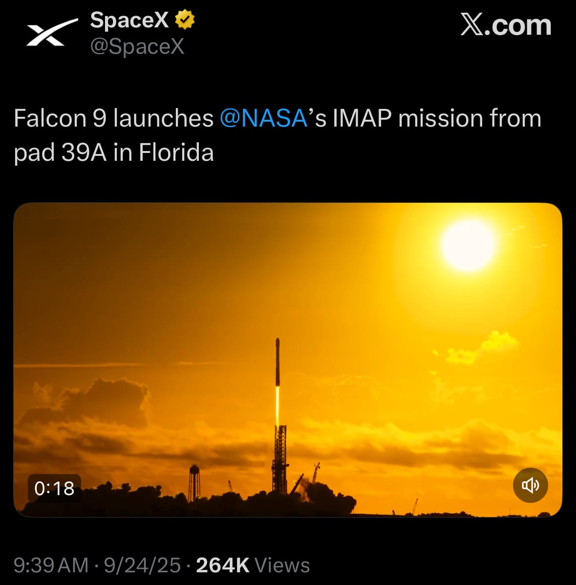 - On September 24, 2025, SpaceX successfully launched a Falcon 9 rocket from Launch Pad 39A at NASA's Kennedy Space Center in Florida at 7:30 a.m. Eastern Daylight Time (11:30 GMT), carrying NASA's Interstellar Mapping and Acceleration Probe spacecraft along with two secondary payloads: NASA's Tandem Reconnection and Cusp Electrodynamics Reconnaissance Satellites and NOAA's Space Weather Follow-On mission.