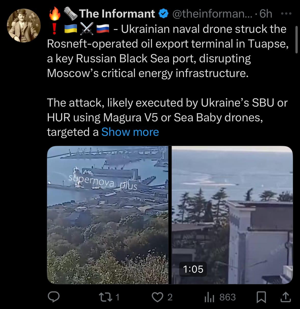 - On September 24, 2025, Ukrainian forces carried out drone strikes on Russian Black Sea ports, including the Rosneft-operated oil export terminal in Tuapse using unmanned surface vehicles like the Magura V5 or Sea Baby drones, causing explosions at the oil loading pier that handles products such as fuel oil, vacuum gas oil, and high-sulfur diesel. Simultaneous strikes targeted Novorossiysk, resulting in two civilian deaths and six injuries, leading to a local state of emergency, evacuations along the Tuapse coast, and a temporary halt to oil shipments from both ports, which are essential for exporting millions of tons of crude oil each year.