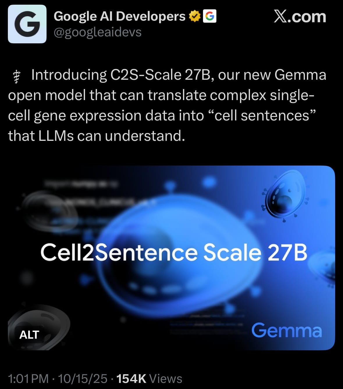 - On October 15, 2025, Google, working with Yale University, launched C2S-Scale 27B, a new AI model designed to study how cells work by analyzing complex biological data. Based on the open Gemma 2 model with 27 billion parameters, it processes cell information like sentences, handling over a billion pieces of data to help with tasks like testing potential drugs or coming up with new medical ideas. For example, it found a drug called silmitasertib that might help the immune system fight tumors in certain conditions, and tests on real cells backed this up. The model is now available for researchers to use through Hugging Face (Open Source), with the goal of speeding up discoveries in areas like cancer treatment.