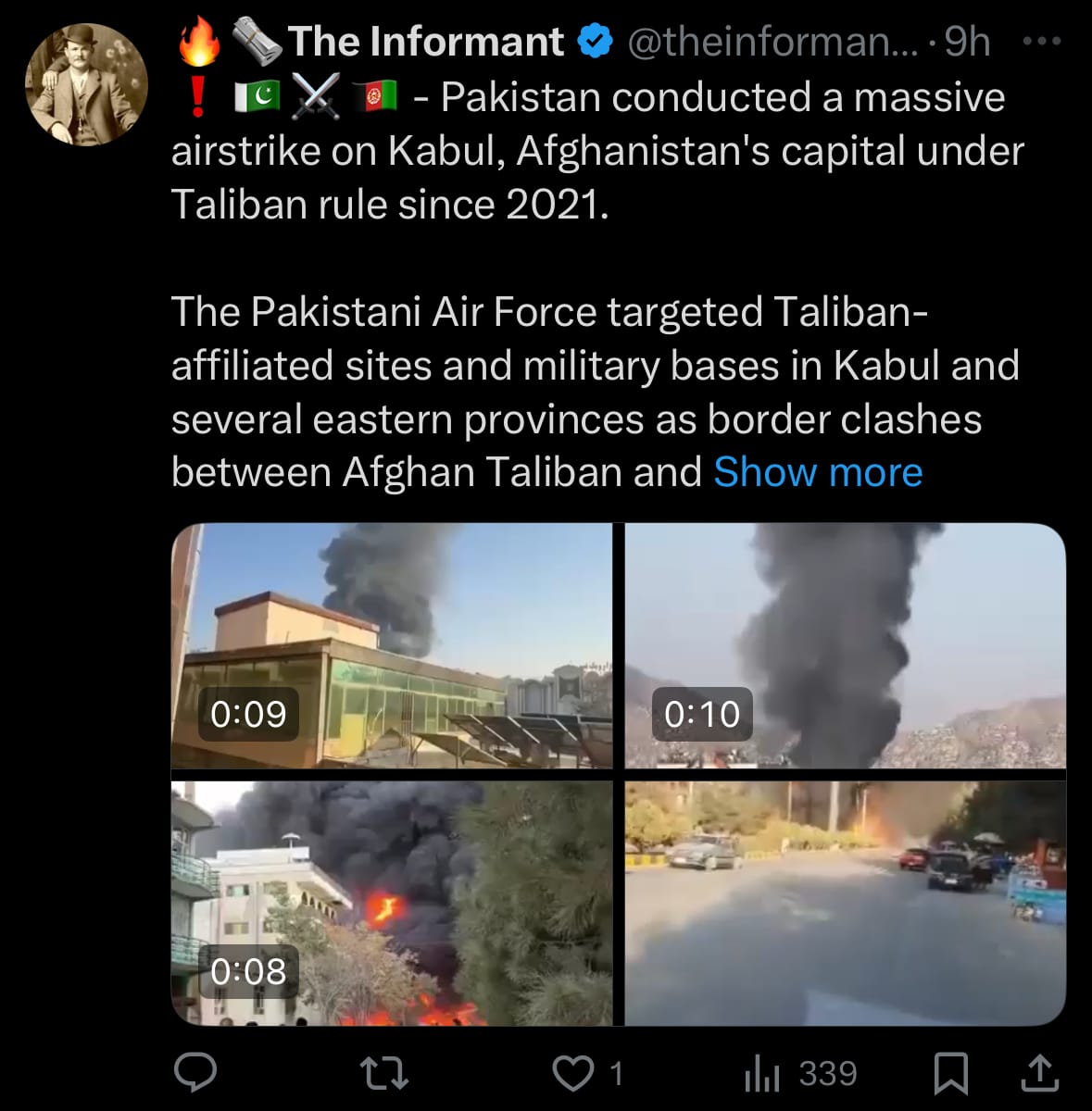 - On October 15, 2025, Pakistan conducted airstrikes on Kabul, Afghanistan's capital under Taliban control since 2021, as well as on Spin Boldak in Kandahar province and other eastern areas, during ongoing border clashes that reached their third day. The strikes hit sites linked to the Taliban, including military posts, with several explosions reported in Kabul, though some sources suggested a fuel tanker accident may have caused one major blast. Afghan reports indicated at least 15 civilian deaths and injuries in Spin Boldak from the airstrikes and border shelling, with no confirmed casualties in Kabul. The fighting, centered in areas like Paktika and Kurram, involves artillery and ground combat, reflecting rising tensions along the shared border.