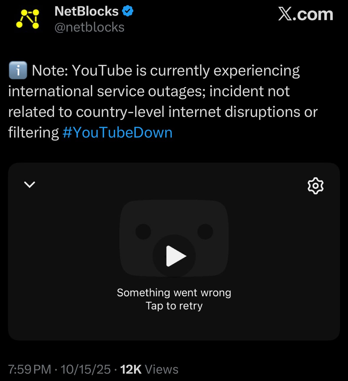 - Yesterday, October 15, 2025, YouTube experienced a widespread global outage starting around 7 p.m. EST, affecting hundreds of thousands of users across regions including the US, Europe, Asia, and Latin America. Downdetector recorded over 350,000 reports of issues, with users encountering playback errors, difficulties accessing videos on both the website and mobile apps, and problems with search functionality and account logins. The disruption also extended to related services like YouTube TV and YouTube Music, leading to frustration among viewers and content creators.