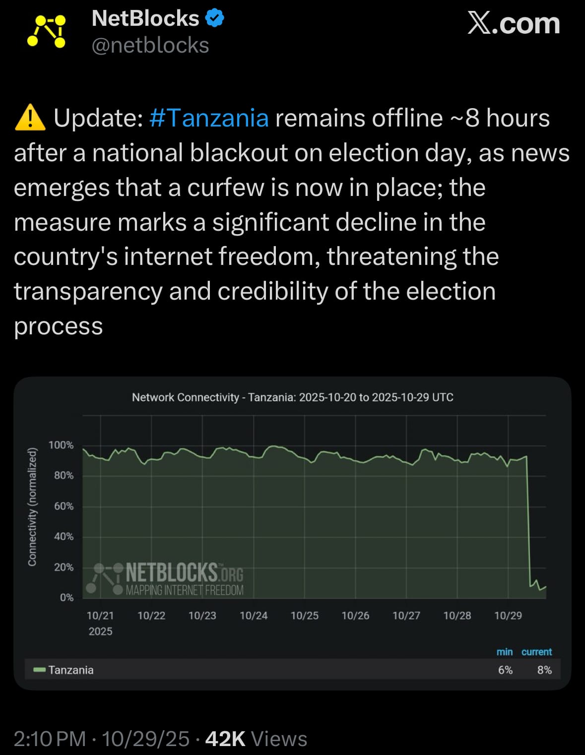 - On October 29, 2025, Tanzania faced a countrywide internet outage during its general election, as President Samia Suluhu Hassan and the ruling Chama Cha Mapinduzi party aimed to maintain control. Connectivity problems began early, impacting social media, apps, and overall access, with groups like NetBlocks noting a traffic plunge likely due to a government-ordered shutdown. The day saw disorder, with protests in places like Dar es Salaam and Arusha, police-youth clashes, military presence, and a 6 p.m. curfew. Injuries occurred amid the turmoil, plus reports of low voter participation, barred opposition candidates, intimidation, and voting issues.