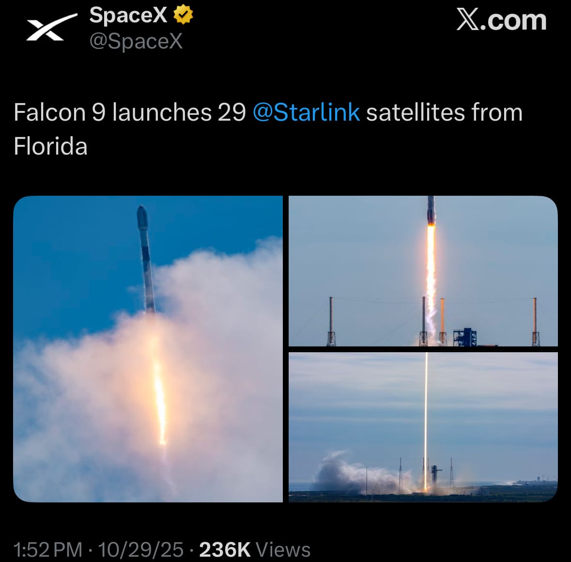 - Yesterday, October 29, 2025, SpaceX successfully launched a Falcon 9 rocket from Space Launch Complex 40 at Cape Canaveral Space Force Station in Florida, deploying 29 Starlink satellites into low-Earth orbit as part of the Starlink 10-37 mission to expand its global broadband network.