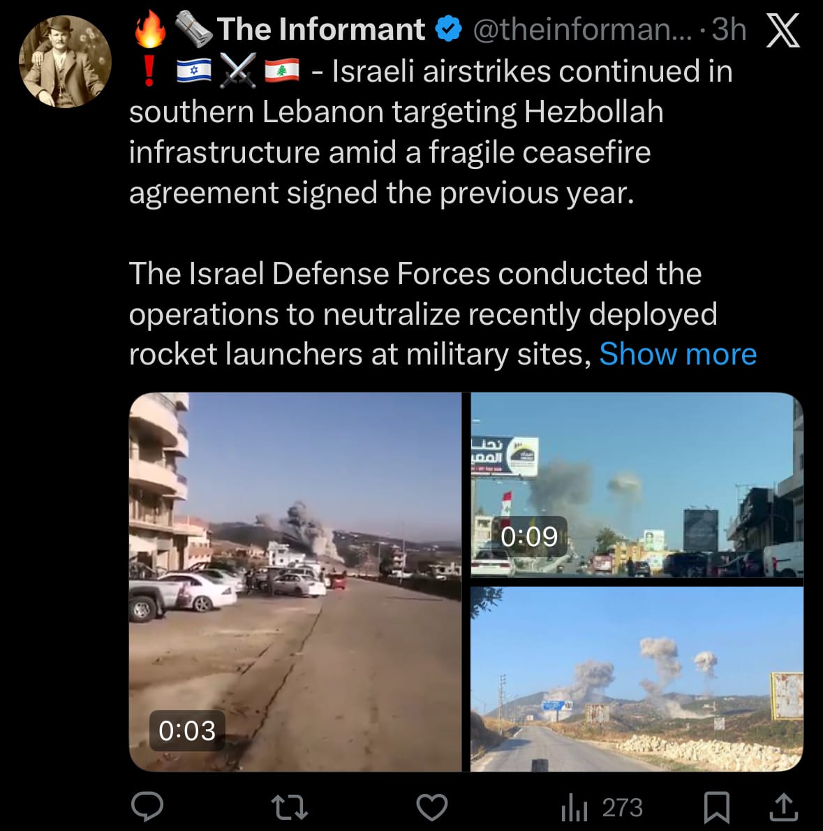 - On November 27, 2025, the Israel Defense Forces carried out a series of airstrikes in southern Lebanon targeting sites associated with Hezbollah, including alleged rocket launchers, weapons depots, and military infrastructure in the Jezzine district and Nabatieh region. Operations focused on areas near the villages of Jarmaq and Mahmoudiyeh, as well as highlands between Jabal al-Rafi and Jarmaq Heights, Aiyshiyyeh, Kfar Rema, and Iqlim al-Tuffah, following intelligence on the group's rearmament activities despite a ceasefire agreement reached in November 2024. The IDF stated these actions were necessary to prevent Hezbollah from rebuilding offensive capabilities, while affirming commitment to the truce terms that require the group's disarmament south of the Litani River and Israeli withdrawal from certain positions.
