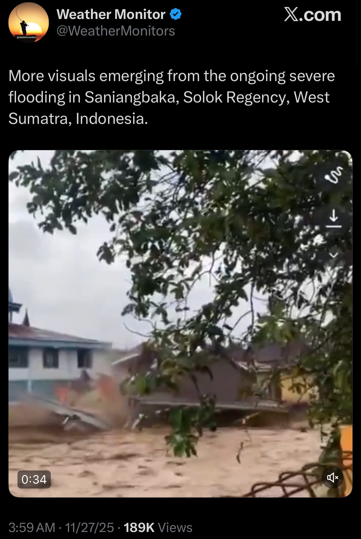 - On November 27, 2025, torrential monsoon rains triggered by a rare tropical cyclone, Senyar, caused severe flash floods and landslides across Indonesia's Sumatra island, particularly in North Sumatra province, resulting in at least 49 deaths and 67 people missing, according to the National Disaster Management Agency. Rivers burst their banks in multiple districts, including Central Tapanuli, North Tapanuli, and South Tapanuli, submerging over 2,000 homes and public buildings, destroying bridges, and uprooting trees, while landslides buried villages under mud and debris. Rescuers, using rubber boats and ropes, evacuated nearly 5,000 residents to temporary shelters amid power outages and blocked roads, with operations hampered by ongoing downpours and a "total cutoff" of communications in remote areas; authorities reported additional impacts in West Sumatra and Aceh, where 10 districts were flooded.