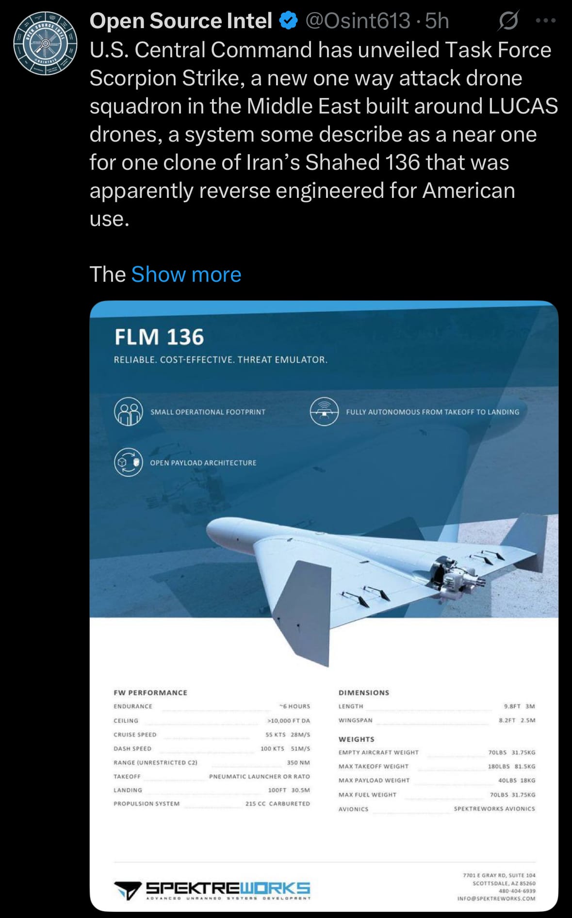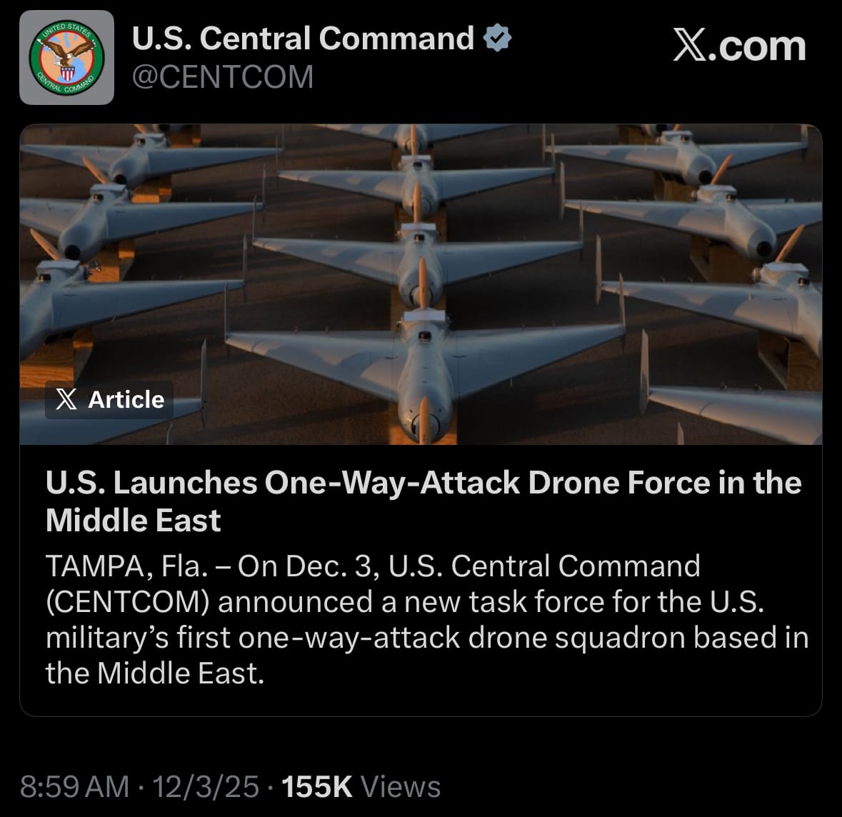 - On December 3, 2025, U.S. Central Command officially launched Task Force Scorpion Strike, a new special-operations drone unit operating in the Middle East. The squadron is equipped with Low-Cost Uncrewed Combat Attack System (LUCAS) one-way attack drones and is already deployed at an undisclosed base. CENTCOM stated the unit’s purpose is to provide rapid, low-cost strike options against threats such as Iranian-backed militias and Houthi forces in Yemen. The LUCAS drone was developed by U.S. company SpektreWorks using reverse-engineering of a captured Iranian Shahed-136. It closely resembles the Iranian design in shape, size, and performance but is produced domestically.